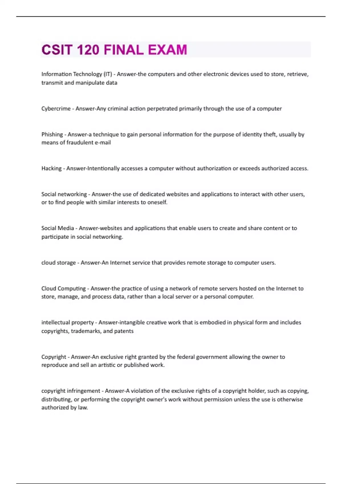 Information Technology (IT) - Answer-the computers and other electronic devices used to store, retrieve, transmit and manipulate data Cybercrime - Answer-Any criminal action perpetrated primarily through the use of a computer Phishing - Answer-a technique to gain personal information for the purpose of identity theft, usually by means of fraudulent e-mail Hacking - Answer-Intentionally accesses a computer without authorization or exceeds authorized access. Social networking - Answer-the use of dedicated websites and applications to interact with other users, or to find people with similar interests to oneself. Social Media - Answer-websites and applications that enable users to create and share content or to participate in social networking. cloud storage - Answer-An Internet service that provides remote storage to computer users. Cloud Computing - Answer-the practice of using a network of remote servers hosted on the Internet to store, manage, and process data, rather than a local server or a personal computer. intellectual property - Answer-intangible creative work that is embodied in physical form and includes copyrights, trademarks, and patents Copyright - Answer-An exclusive right granted by the federal government allowing the owner to reproduce and sell an artistic or published work. copyright infringement - Answer-A violation of the exclusive rights of a copyright holder, such as copying, distributing, or performing the copyright owner's work without permission unless the use is otherwise authorized by t - Answer-exclusive rights over an invention Trademark - Answer-a symbol, word, or logo representing a company or product. Digital Rights Management - Answer-a strategy designed to prevent illegal distribution of movies, music, and other digital content Public Domain - Answer-Creative work that's not copyrighted and therefore free for you to use whenever you want. Plagiarism - Answer-taking credit for someone else's writing or ideas