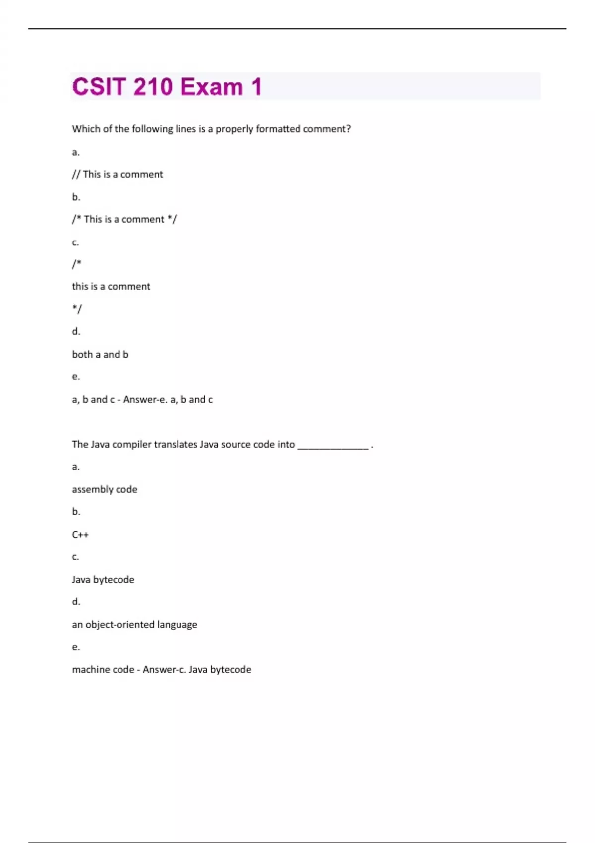 Which of the following lines is a properly formatted comment? a. // This is a comment b. /* This is a comment */ c. /* this is a comment */ d. both a and b e. a, b and c - Answer-e. a, b and c The Java compiler translates Java source code into _____________ . a. assembly code b. C++ c. Java bytecode d. an object-oriented language e. machine code - Answer-c. Java bytecodeClasses can be created from other classes by using _______________ . a. machine code b. attributes c. polymorphism d. encapsulation e. inheritance - Answer-e. inheritance