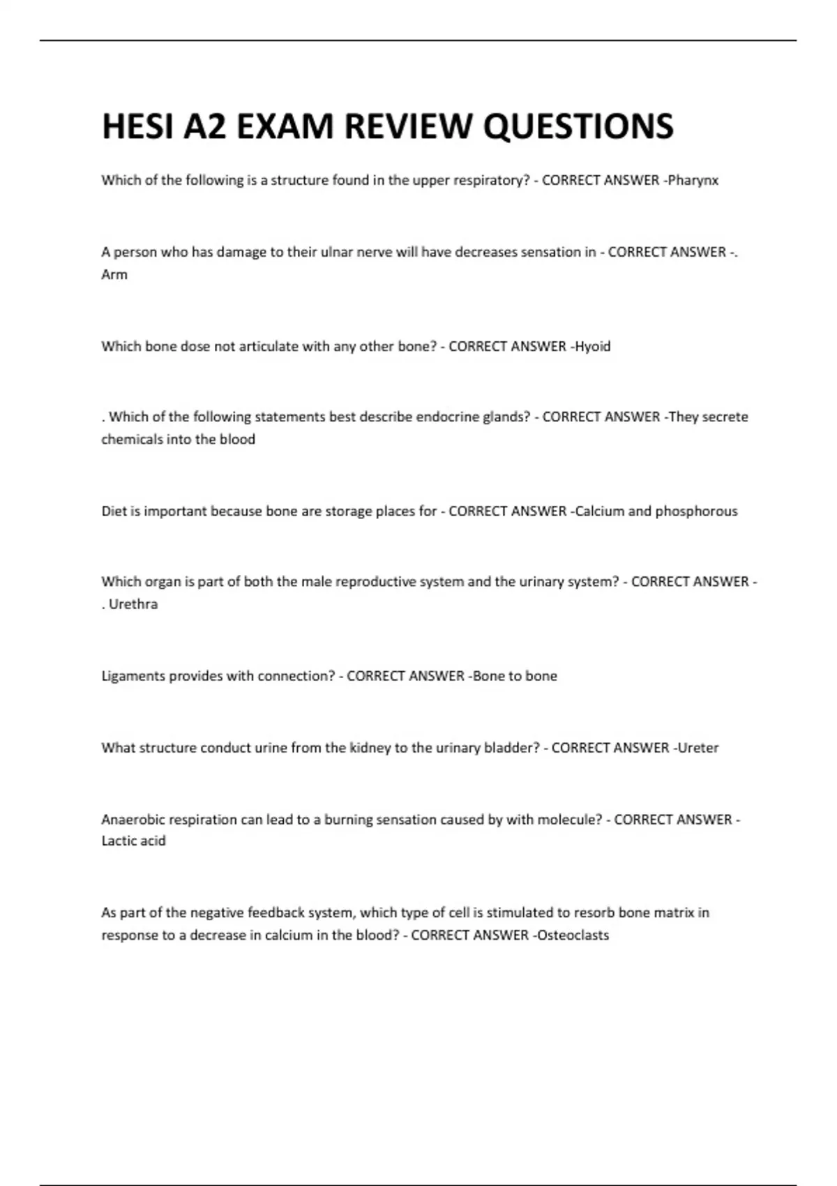 HESI A2 EXAM REVIEW QUESTIONS Which of the following is a structure found in the upper respiratory? - CORRECT ANSWER -Pharynx A person who has damage to their ulnar nerve will have decreases sensation in - CORRECT ANSWER -. Arm Which bone dose not articulate with any other bone? - CORRECT ANSWER -Hyoid . Which of the following statements best describe endocrine glands? - CORRECT ANSWER -They secrete chemicals into the blood Diet is important because bone are storage places for - CORRECT ANSWER -Calcium and phosphorous Which organ is part of both the male reproductive system and the urinary system? - CORRECT ANSWER . Urethra Ligaments provides with connection? - CORRECT ANSWER -Bone to bone What structure conduct urine from the kidney to the urinary bladder? - CORRECT ANSWER -Ureter Anaerobic respiration can lead to a burning sensation caused by with molecule? - CORRECT ANSWER Lactic acid As part of the negative feedback system, which type of cell is stimulated to resorb bone matrix in response to a decrease in calcium in the blood? - CORRECT ANSWER -Osteoclasts