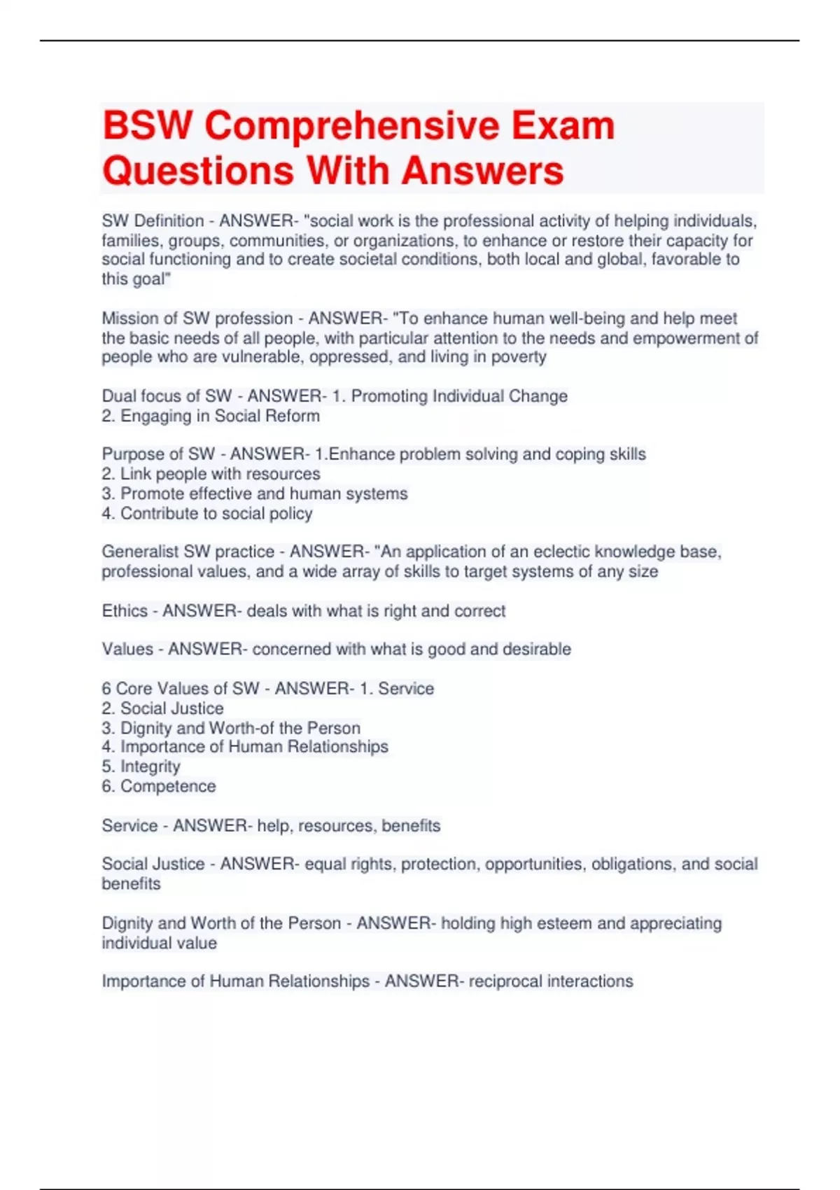 BSW Comprehensive Exam Questions With Answers with your client SW Definition - ANSWER- "social work is the professional activity of helping individuals, families, groups, communities, or organizations, to enhance or restore their capacity for social functioning and to create societal conditions, both local and global, favorable to this goal" Mission of SW profession - ANSWER- "To enhance human well-being and help meet the basic needs of all people, with particular attention to the needs and empowerment of people who are vulnerable, oppressed, and living in poverty Dual focus of SW - ANSWER- 1. Promoting Individual Change 2. Engaging in Social Reform Purpose of SW - ANSWER- 1.Enhance problem solving and coping skills 2. Link people with resources 3. Promote effective and human systems 4. Contribute to social policy Generalist SW practice - ANSWER- "An application of an eclectic knowledge base, professional values, and a wide array of skills to target systems of any size Ethics - ANSWER- deals with what is right and correct Values - ANSWER- concerned with what is good and desirable 6 Core Values of SW - ANSWER- 1. Service 2. Social Justice 3. Dignity and Worth-of the Person 4. Importance of Human Relationships 5. Integrity 6. Competence Service - ANSWER- help, resources, benefits Social Justice - ANSWER- equal rights, protection, opportunities, obligations, and social benefits Dignity and Worth of the Person - ANSWER- holding high esteem and appreciating individual value Importance of Human Relationships - ANSWER- reciprocal interactions Integrity - ANSWER- trustworthiness and adherence to moral ideals Competence - ANSWER- having necessary skill and abilities to work effectively with client Ethical Standards and Professional Responsibilities - ANSWER- To Clients To Colleagues In Practice Settings As Professionals To the Social Work Profession To the Broader Society Diversity - ANSWER- the vast range of differences among people Planned Change Process - ANSWER- 1. Engagement 2. Assessment 3. Planning 4. Implementation 5. Evaluation 6. Termination 7. Follow-up Target Systems - ANSWER- micro, mezzo, macro Counselor - ANSWER- provide guidance Enabler - ANSWER- provide support and encouragement Mediator - ANSWER- resolve arguments Educator - ANSWER- provide information Evaluator - ANSWER- assess one's own practice Broker - ANSWER- link to resources