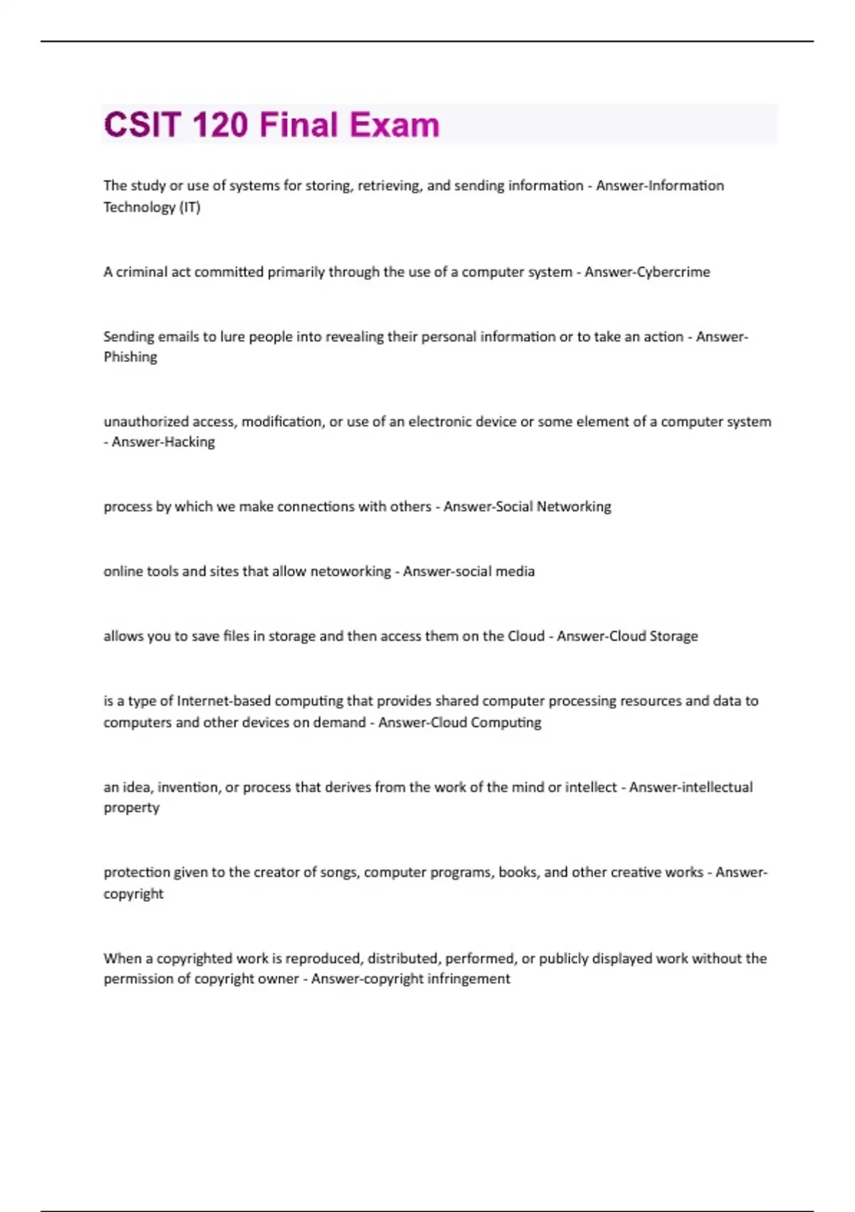 CSIT 120 Final Exam Questions & Answers Already Graded A+