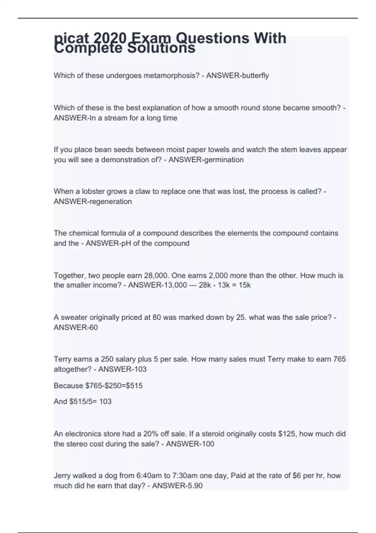 Which of these undergoes metamorphosis? - ANSWER-butterfly Which of these is the best explanation of how a smooth round stone became smooth? - ANSWER-In a stream for a long time If you place bean seeds between moist paper towels and watch the stem leaves appear you will see a demonstration of? - ANSWER-germination When a lobster grows a claw to replace one that was lost, the process is called? - ANSWER-regeneration The chemical formula of a compound describes the elements the compound contains and the - ANSWER-pH of the compound Together, two people earn 28,000. One earns 2,000 more than the other. How much is the smaller income? - ANSWER-13,000 --- 28k - 13k = 15k A sweater originally priced at 80 was marked down by 25. what was the sale price? - ANSWER-60 Terry earns a 250 salary plus 5 per sale. How many sales must Terry make to earn 765 altogether? - ANSWER-103 Because $765-$250=$515 And $515/5= 103 An electronics store had a 20% off sale. If a steroid originally costs $125, how much did the stereo cost during the sale? - ANSWER-100