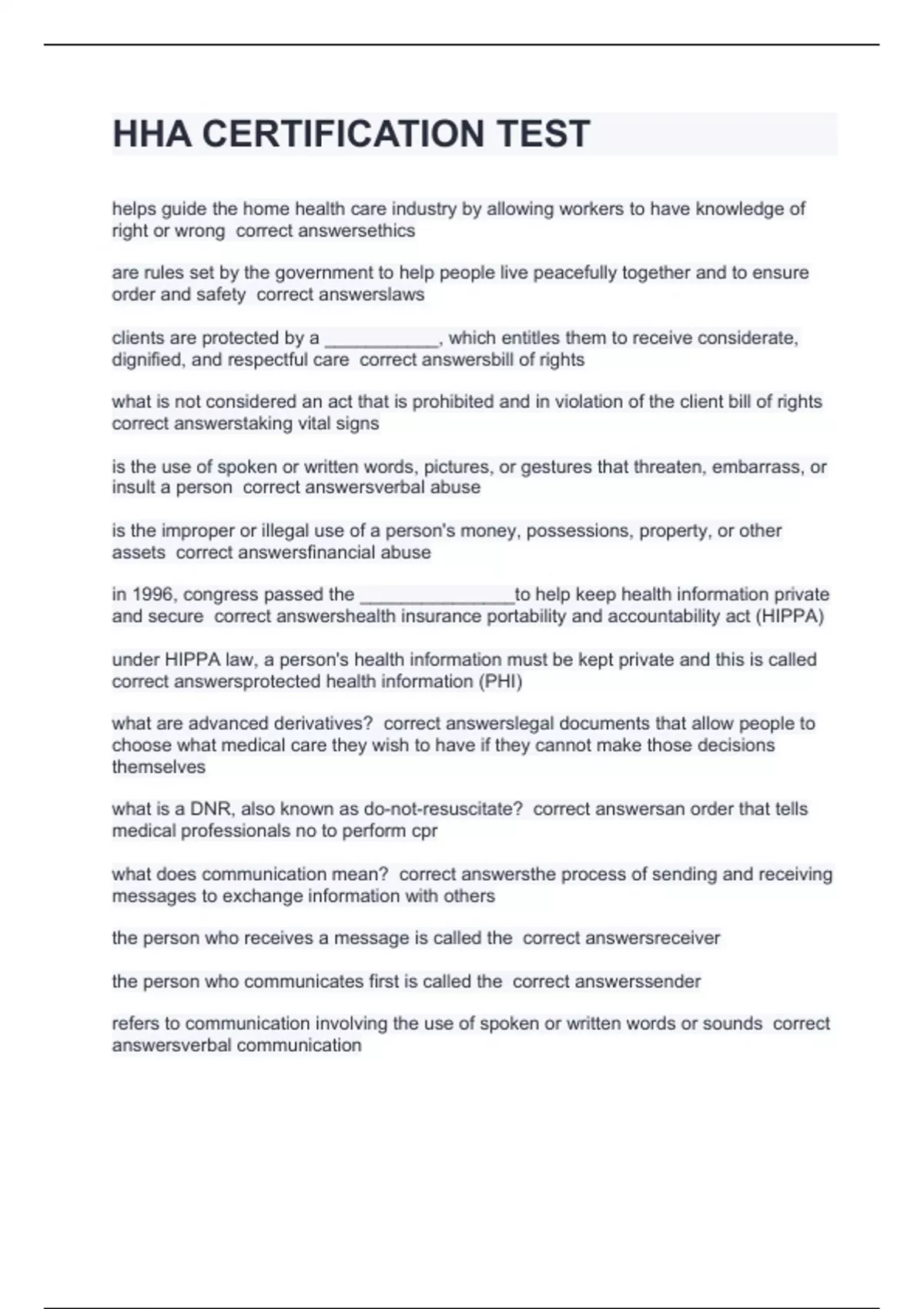 helps guide the home health care industry by allowing workers to have knowledge of right or wrong correct answersethics are rules set by the government to help people live peacefully together and to ensure order and safety correct answerslaws clients are protected by a ___________, which entitles them to receive considerate, dignified, and respectful care correct answersbill of rights what is not considered an act that is prohibited and in violation of the client bill of rights correct answerstaking vital signs is the use of spoken or written words, pictures, or gestures that threaten, embarrass, or insult a person correct answersverbal abuse is the improper or illegal use of a person's money, possessions, property, or other assets correct answersfinancial abuse in 1996, congress passed the _______________to help keep health information private and secure correct answershealth insurance portability and accountability act (HIPPA) under HIPPA law, a person's health information must be kept private and this is called correct answersprotected health information (PHI) what are advanced derivatives? correct answerslegal documents that allow people to choose what medical care they wish to have if they cannot make those decisions themselves what is a DNR, also known as do-not-resuscitate? correct answersan order that tells medical professionals no to perform cpr what does communication mean? correct answersthe process of sending and receiving messages to exchange information with others the person who receives a message is called the correct answersreceiver the person who communicates first is called the correct answerssender refers to communication involving the use of spoken or written words or sounds correct answersverbal communication