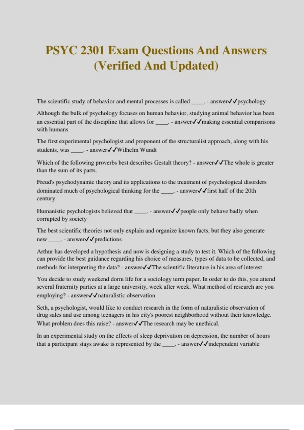 PSYC 2301 Exam Questions And Answers (Verified And Updated) The scientific study of behavior and mental processes is called ____. - answerpsychology Although the bulk of psychology focuses on human behavior, studying animal behavior has been an essential part of the discipline that allows for ____. - answermaking essential comparisons with humans The first experimental psychologist and proponent of the structuralist approach, along with his students, was ____. - answerWilhelm Wundt Which of the following proverbs best describes Gestalt theory? - answerThe whole is greater than the sum of its parts. Freud's psychodynamic theory and its applications to the treatment of psychological disorders dominated much of psychological thinking for the ____. - answerfirst half of the 20th century Humanistic psychologists believed that ____. - answerpeople only behave badly when corrupted by society The best scientific theories not only explain and organize known facts, but they also generate new ____. - answerpredictions Arthur has developed a hypothesis and now is designing a study to test it. Which of the following can provide the best guidance regarding his choice of measures, types of data to be collected, and methods for interpreting the data? - answerThe scientific literature in his area of interest You decide to study weekend dorm life for a sociology term paper. In order to do this, you attend several fraternity parties at a large university, week after week. What method of research are you employing? - answernaturalistic observation Seth, a psychologist, would like to conduct research in the form of naturalistic observation of drug sales and use among teenagers in his city's poorest neighborhood without their knowledge. What problem does this raise? - answerThe research may be unethical. In an experimental study on the effects of sleep deprivation on depression, the number of hours that a participant stays awake is represented by the ____. - answerindependent variable