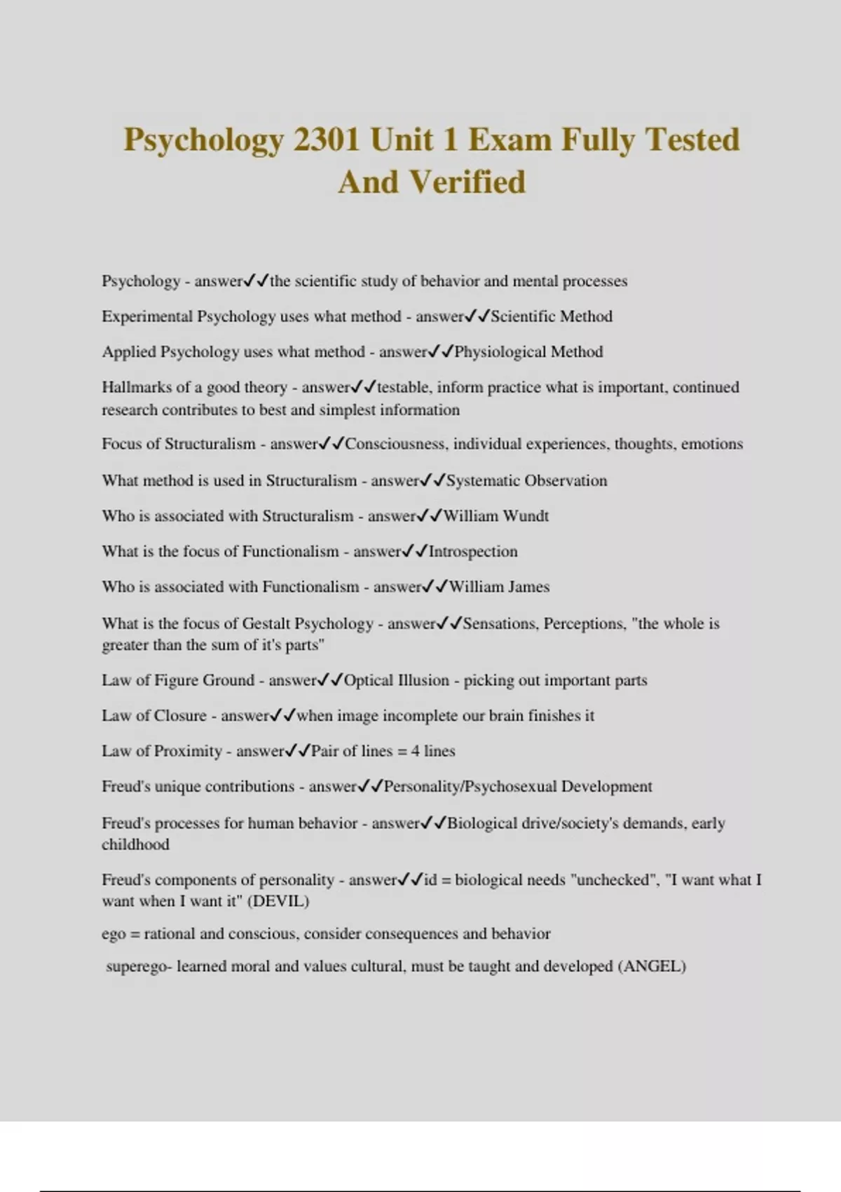 Psychology 2301 Unit 1 Exam Fully Tested And Verified Psychology - answerthe scientific study of behavior and mental processes Experimental Psychology uses what method - answerScientific Method Applied Psychology uses what method - answerPhysiological Method Hallmarks of a good theory - answertestable, inform practice what is important, continued research contributes to best and simplest information Focus of Structuralism - answerConsciousness, individual experiences, thoughts, emotions What method is used in Structuralism - answerSystematic Observation Who is associated with Structuralism - answerWilliam Wundt What is the focus of Functionalism - answerIntrospection Who is associated with Functionalism - answerWilliam James What is the focus of Gestalt Psychology - answerSensations, Perceptions, "the whole is greater than the sum of it's parts" Law of Figure Ground - answerOptical Illusion - picking out important parts Law of Closure - answerwhen image incomplete our brain finishes it Law of Proximity - answerPair of lines = 4 lines Freud's unique contributions - answerPersonality/Psychosexual Development Freud's processes for human behavior - answerBiological drive/society's demands, early childhood Freud's components of personality - answerid = biological needs "unchecked", "I want what I want when I want it" (DEVIL) ego = rational and conscious, consider consequences and behavior superego- learned moral and values cultural, must be taught and developed (ANGEL)
