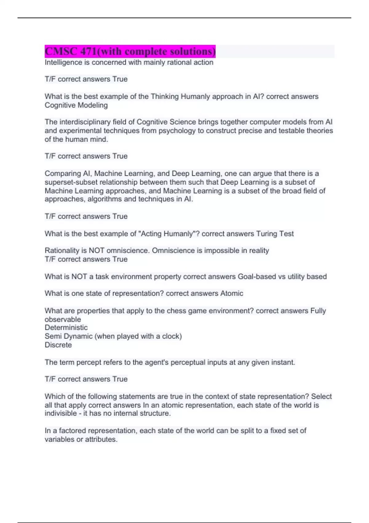 Intelligence is concerned with mainly rational action T/F correct answers True What is the best example of the Thinking Humanly approach in AI? correct answers Cognitive Modeling The interdisciplinary field of Cognitive Science brings together computer models from AI and experimental techniques from psychology to construct precise and testable theories of the human mind. T/F correct answers True Comparing AI, Machine Learning, and Deep Learning, one can argue that there is a superset-subset relationship between them such that Deep Learning is a subset of Machine Learning approaches, and Machine Learning is a subset of the broad field of approaches, algorithms and techniques in AI. T/F correct answers True What is the best example of "Acting Humanly"? correct answers Turing Test Rationality is NOT omniscience. Omniscience is impossible in reality T/F correct answers True What is NOT a task environment property correct answers Goal-based vs utility based What is one state of representation? correct answers Atomic What are properties that apply to the chess game environment? correct answers Fully observable Deterministic Semi Dynamic (when played with a clock) Discrete The term percept refers to the agent's perceptual inputs at any given instant. T/F correct answers True Which of the following statements are true in the context of state representation? Select all that apply correct answers In an atomic representation, each state of the world is indivisible - it has no internal structure. In a factored representation, each state of the world can be split to a fixed set of variables or attributes.