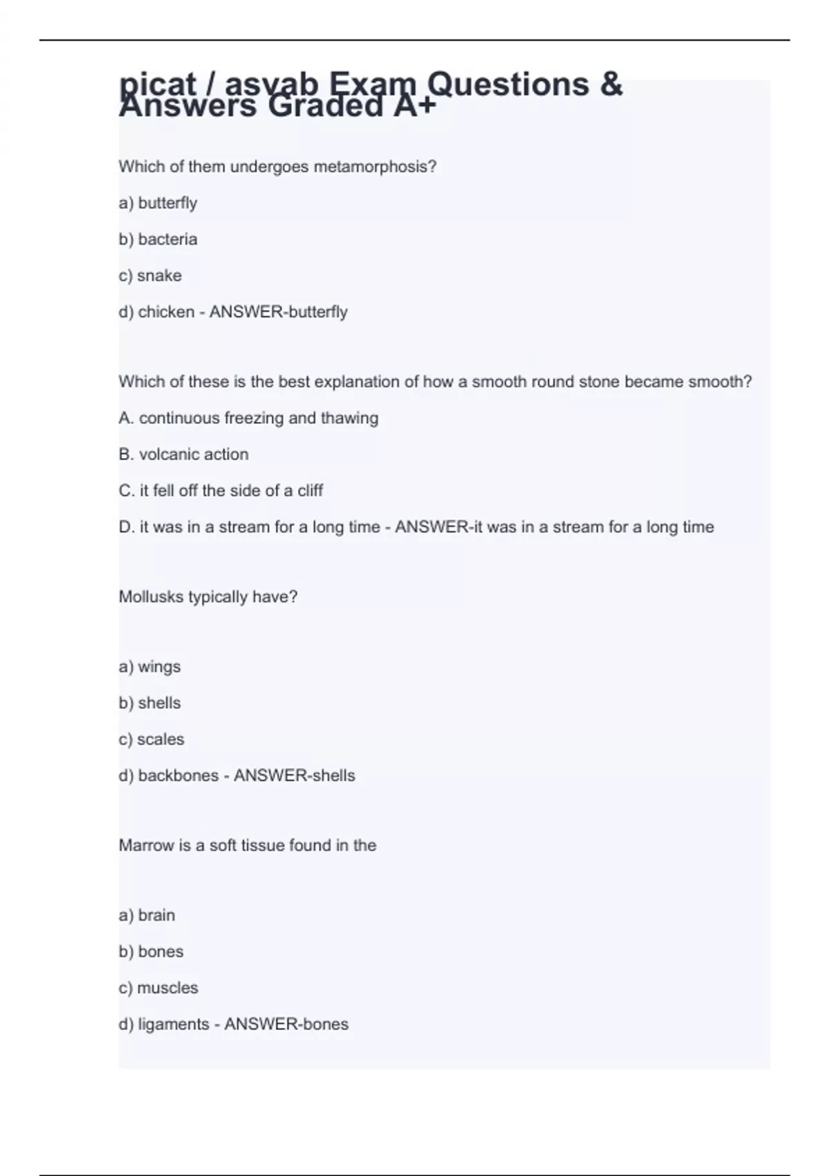 Which of them undergoes metamorphosis? a) butterfly b) bacteria c) snake d) chicken - ANSWER-butterfly Which of these is the best explanation of how a smooth round stone became smooth? A. continuous freezing and thawing B. volcanic action C. it fell off the side of a cliff D. it was in a stream for a long time - ANSWER-it was in a stream for a long time Mollusks typically have? a) wings b) shells c) scales d) backbones - ANSWER-shells Marrow is a soft tissue found in the a) brain b) bones c) muscles d) ligaments - ANSWER-bones