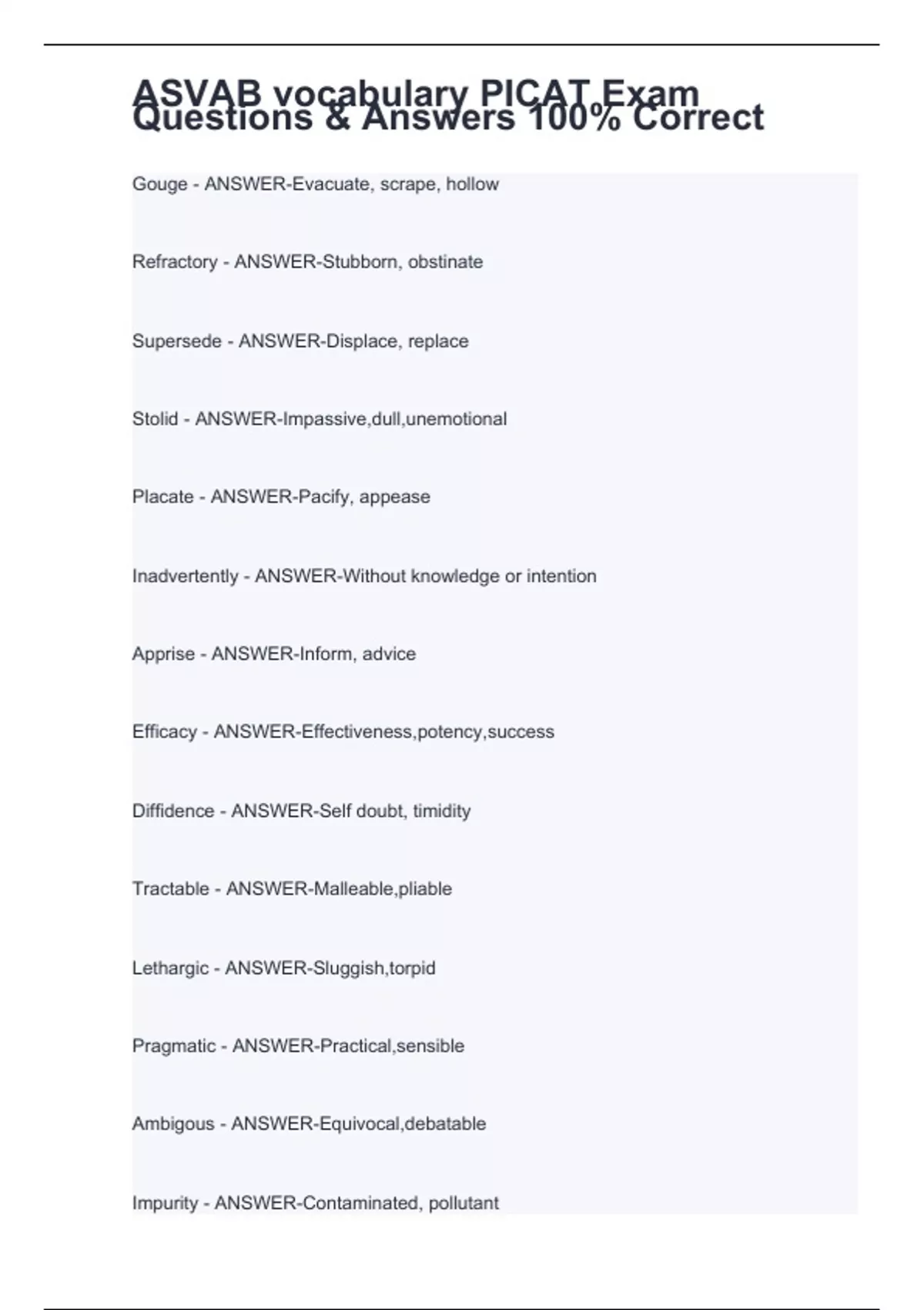 ASVAB vocabulary PICAT Exam Questions & Answers 100% Correct