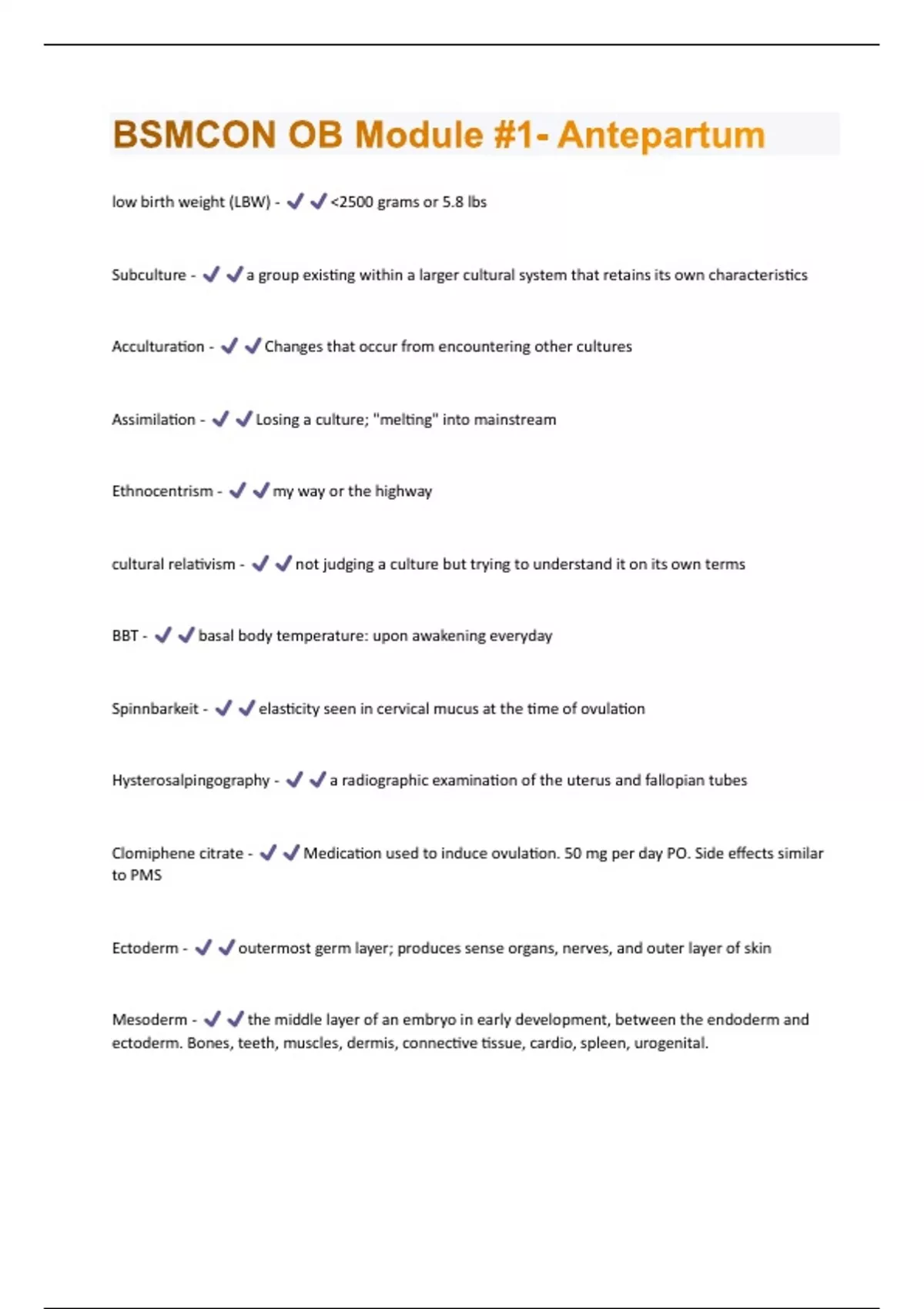 low birth weight (LBW) - <2500 grams or 5.8 lbs Subculture - a group existing within a larger cultural system that retains its own characteristics Acculturation - Changes that occur from encountering other cultures Assimilation - Losing a culture; "melting" into mainstream Ethnocentrism - my way or the highway cultural relativism - not judging a culture but trying to understand it on its own terms BBT - basal body temperature: upon awakening everyday Spinnbarkeit - elasticity seen in cervical mucus at the time of ovulation Hysterosalpingography - a radiographic examination of the uterus and fallopian tubes Clomiphene citrate - Medication used to induce ovulation. 50 mg per day PO. Side effects similar to PMS Ectoderm - outermost germ layer; produces sense organs, nerves, and outer layer of skin Mesoderm - the middle layer of an embryo in early development, between the endoderm and ectoderm. Bones, teeth, muscles, dermis, connective tissue, cardio, spleen, urogenital.Endoderm - the inner germ layer that develops into the lining of the digestive and respiratory systems, liver, bladder and vagina oligohydramnios - too little amniotic fluid; <500mL polyhydramnios - excessive amniotic fluid; mL Wharton's jelly - A special connective tissue that surrounds blood vessels in umbilical cord to prevent compression Dirty duncan - Maternal side of placenta, fleshy/red. Consists of decidual basalis Shiny schultz - Fetal side of placenta; consists of chorionic villi Viability - 22-25 weeks gestation Ductus Venosus - most blood flows through directly into the inferior vena cava, by-passing the liver foramen ovale - connects the two atria in the fetal heart Ductus Arteriosus - allows lots of blood to pass from the pulmonary artery to the descending aorta Toxoplasmosis - a parasite that is most commonly transmitted from pets to humans by contact with contaminated animal feces Preterm - >20 weeks but <37 weeks Late preterm - between 34wks/0 days and 36 wks/6 daysEarly term - between 37wks/0days and 38wks/6days Full term - Between 39wks/0days and 40wks/6days