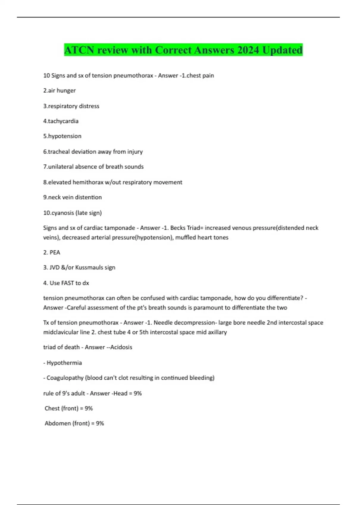 ATCN review with Correct Answers 2024 Updated 10 Signs and sx of tension pneumothorax - Answer - pain hunger ratory distress cardia ension eal deviation away from injury teral absence of breath sounds ted hemithorax w/out respiratory movement vein distention sis (late sign) Signs and sx of cardiac tamponade - Answer -1. Becks Triad= increased venous pressure(distended neck veins), decreased arterial pressure(hypotension), muffled heart tones 2. PEA 3. JVD &/or Kussmauls sign