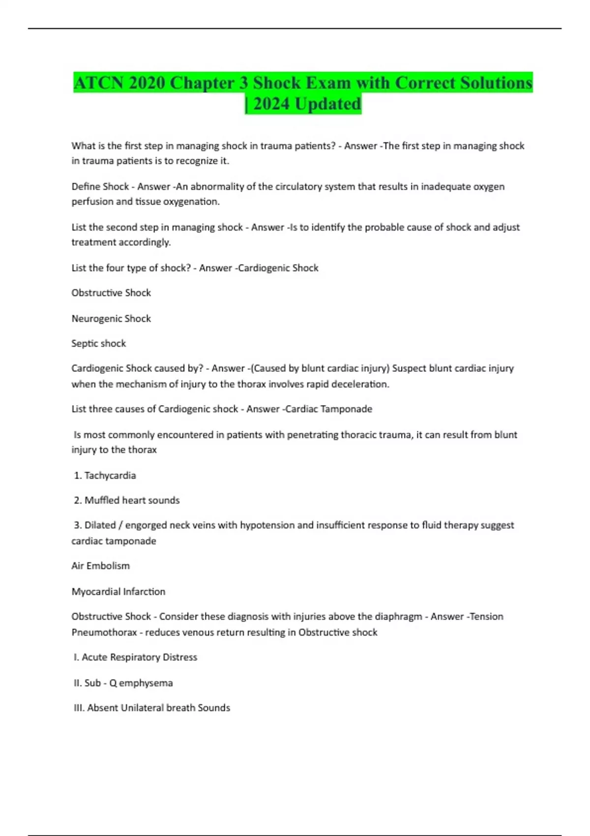 ATCN 2020 Chapter 3 Shock Exam with Correct Solutions | 2024 Updated What is the first step in managing shock in trauma patients? - Answer -The first step in managing shock in trauma patients is to recognize it. Define Shock - Answer -An abnormality of the circulatory system that results in inadequate oxygen perfusion and tissue oxygenation. List the second step in managing shock - Answer -Is to identify the probable cause of shock and adjust treatment accordingly. List the four type of shock? - Answer -Cardiogenic Shock Obstructive Shock Neurogenic Shock Septic shock Cardiogenic Shock caused by? - Answer -(Caused by blunt cardiac injury) Suspect blunt cardiac injury when the mechanism of injury to the thorax involves rapid deceleration. List three causes of Cardiogenic shock - Answer -Cardiac Tamponade Is most commonly encountered in patients with penetrating thoracic trauma, it can result from blunt injury to the thorax 1. Tachycardia 2. Muffled heart sounds 3. Dilated / engorged neck veins with hypotension and insufficient response to fluid therapy suggest cardiac tamponade Air Embolism Myocardial Infarction Obstructive Shock - Consider these diagnosis with injuries above the diaphragm - Answer -Tension Pneumothorax - reduces venous return resulting in Obstructive shock I. Acute Respiratory Distress II. Sub - Q emphysema III. Absent Unilateral breath Sound