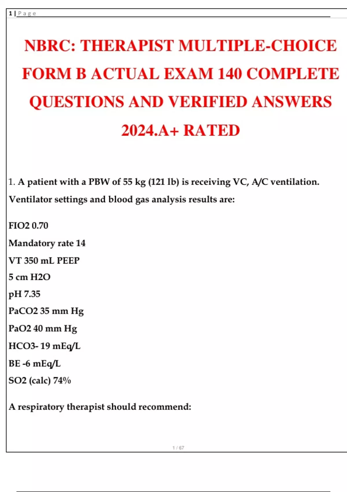 NBRC THERAPIST MULTIPLE-CHOICE FORM B ACTUAL EXAM 140 COMPLETE QUESTIONS AND VERIFIED ANSWERS 2024.A+ RATED