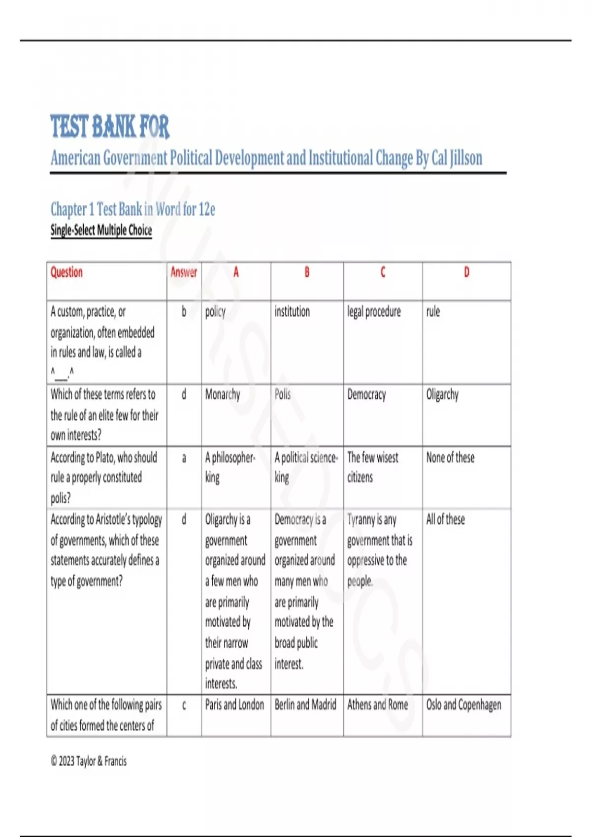 Test Bank for American Government Political Development and Institutional Change By Cal Jillson
