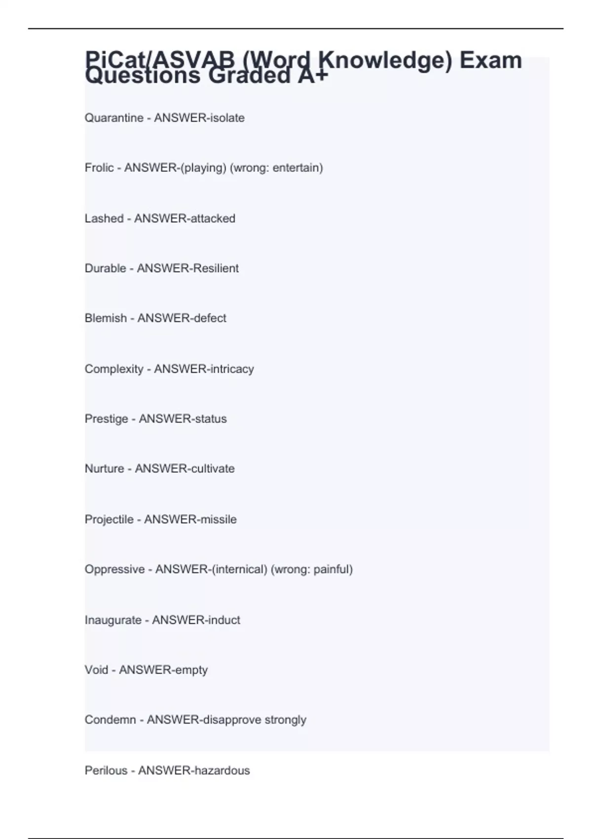 PiCat/ASVAB (Word Knowledge) Exam Questions Graded A+