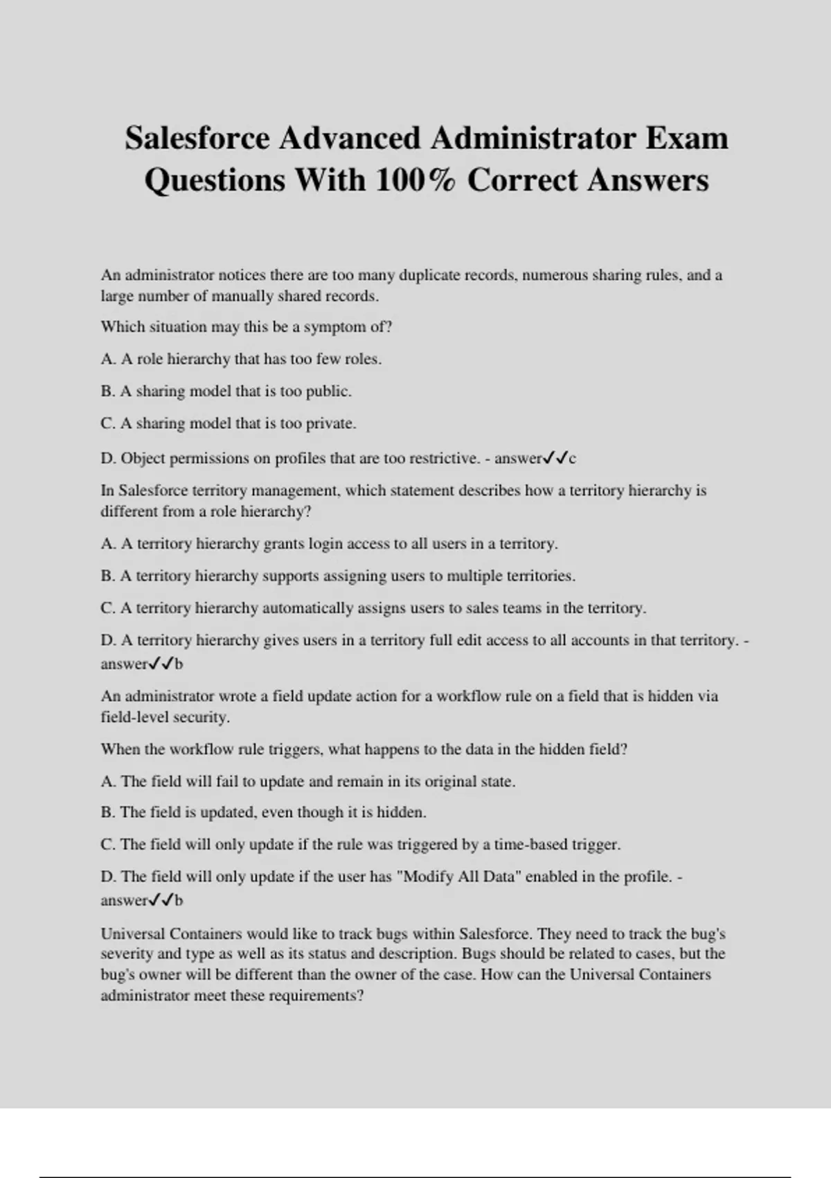 Salesforce Advanced Administrator Exam Questions With 100% Correct Answers An administrator notices there are too many duplicate records, numerous sharing rules, and a large number of manually shared records. Which situation may this be a symptom of? A. A role hierarchy that has too few roles. B. A sharing model that is too public. C. A sharing model that is too private. D. Object permissions on profiles that are too restrictive. - answerc In Salesforce territory management, which statement describes how a territory hierarchy is different from a role hierarchy? A. A territory hierarchy grants login access to all users in a territory. B. A territory hierarchy supports assigning users to multiple territories. C. A territory hierarchy automatically assigns users to sales teams in the territory. D. A territory hierarchy gives users in a territory full edit access to all accounts in that territory. - answerb An administrator wrote a field update action for a workflow rule on a field that is hidden via field-level security. When the workflow rule triggers, what happens to the data in the hidden field? A. The field will fail to update and remain in its original state. B. The field is updated, even though it is hidden. C. The field will only update if the rule was triggered by a time-based trigger. D. The field will only update if the user has "Modify All Data" enabled in the profile. - answerb Universal Containers would like to track bugs within Salesforce. They need to track the bug's severity and type as well as its status and description. Bugs should be related to cases, but the bug's owner will be different than the owner of the case. How can the Universal Containers administrator meet these requirements? A. Create a section on the case page layout. B. Create a field on cases. C. Create a custom object for bugs and relate it to cases. D. Create a relationship between the standard bug object and the standard case object. - answerc Universal Containers currently uses the standard Salesforce CRM product and pricebook objects. Is it possible for Universal Containers to publish product and pricebook information to its corporate website so customers in different regions see the correct product catalog with prices in the local currency? A. Yes, with the Customer Portal. B. No, it is not possible to present multicurrency data. C. Yes, by building a custom integration following the X-to-Web design pattern. D. No, it is not possible to present data stored in standard objects other than cases and solutions to a website. - answerc What is the F Web Services API? - answerset of application functions that can be programatically invoked over the internet The Web Services API is designed around the latest standards, including which three ? . - answerSOAP, WSDL and WS-I Basic Profile Name three platforms (technologies) to which the F API is available. - answerJava, .NET, Perl The Web Services API allows the administrator to mass delete more than 250 records at a time. - answerTrue The Web Services API allows the administrator to perform mass updates to records to clean up duplicate data - answerTrue The Web Services API allows the administrator to perform incremental backups of the data with the APIs data replication methods. - answerTrue Which Salesforce tools use the F API? - answerApex Data Loader, Connect for Microsoft Office, Salesforce for Outlook, Offline Edition What are the most commonly used Web Services API calls? Hint: QURDUCU - answerQuery, Update, Retrieve, Delete, Upsert, Create, Undelete What does the Query API call do? - answerExecutes a query against the specified object (SOQL). What does the Retrieve API Call do? - answerRetrieves one or more objects based on the specified object IDs. What does the Create API Call do? - answerAdds one or more new individual records to your organization's data. What does the Update API Call do? - answerUpdates one or more existing records in your organization's data. What does the Upsert API Call do? - answerPerforms a create or an update of an object based on match of an ID field. What does the Delete API Call do? - answerDeletes one or more individual objects from your organization's data. What does the Undelete API Call do? - answerUndeletes eligible records from the recycle bin. What are the capabilities of the F Metadata API? - answerAdd data to Salesforce orgs, delete standard fields on custom objects, and create, update, and delete custom objects and fields programmatically. What is the most common use of the F Metadata API? - answerTo migrate changes from a sandbox or testing organization to a production environment. Which three method calls does the F Metadata API support? - answerQuery, Create, Upsert What are the two easiest ways to access the F Metadata API? - answerIDE, Migration Tool Which tool does the IDE use? - answerEclipse Which tool does the Migration Tool use? - answerAnt What are the capabilities of Salesforce Connect for MS Office? - answerExcel Add-in delivers salesforce reports into Excel. Word Add-in allows you to insert Salesforce merge fields into a Word mail merge template What are the capabilities of Salesforce Connect for Lotus Notes? - answerAdd-in that provides similar functionality to the MS add-ins What are the capabilities of Salesforce Connect Offline? - answerClient application