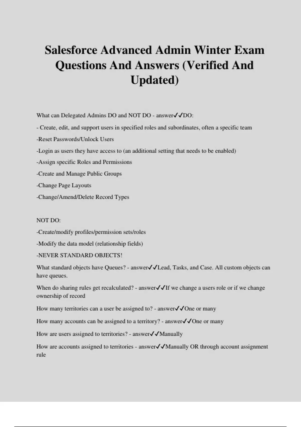 Salesforce Advanced Admin Winter Exam Questions And Answers (Verified And Updated) What can Delegated Admins DO and NOT DO - answerDO: - Create, edit, and support users in specified roles and subordinates, often a specific team -Reset Passwords/Unlock Users -Login as users they have access to (an additional setting that needs to be enabled) -Assign specific Roles and Permissions -Create and Manage Public Groups -Change Page Layouts -Change/Amend/Delete Record Types NOT DO: -Create/modify profiles/permission sets/roles -Modify the data model (relationship fields) -NEVER STANDARD OBJECTS! What standard objects have Queues? - answerLead, Tasks, and Case. All custom objects can have queues. When do sharing rules get recalculated? - answerIf we change a users role or if we change ownership of record How many territories can a user be assigned to? - answerOne or many How many accounts can be assigned to a territory? - answerOne or many How are users assigned to territories? - answerManually How are accounts assigned to territories - answerManually OR through account assignment rule How many territories can an opportunity be assigned to? - answerOne How are reports and dashboards shared? - answerCustom folders are created and can be shared with users, role, roles and subordinates, or public groups Can have View/Edit/Manage access What are the three lifecycle objects and their business processes? - answerLead - Lead Process Case - Support Process Opportunity - Sales Process How many parents can a child have in a Lookup Relatonship? - answer40 How many layers deep can a master-detail relationship be? - answer3 Can a standard object be a child in a master-detail? - answerno How many parents can a child have in a master-detail - answer2 What are the ways you can approve/reject an approval process step? - answerIn Salesforce, Email, or Chatter What are the steps of an approval process? - answer1. Submit for Approval (done manually or through automation) 2. Entry Criteria: checks if the record should be approved 3. Initial Submission Actions: Actions and locks/unlocks records 4. Approval Steps: Can be one or multiple steps 5.Final Rejection Actions OR Final Approval Actions Can anyone edit a record once an approval process locks it? - answerYes, an ADMIN or you can set specific people to edit the record What are the ways you can troubleshoot something stuck in an approval process? - answer- Look at Approval History related list -Create and run Approval History Reports Full Sandbox - answerData types copied: entire production org including data and metadata Capacity: Based on its production Org