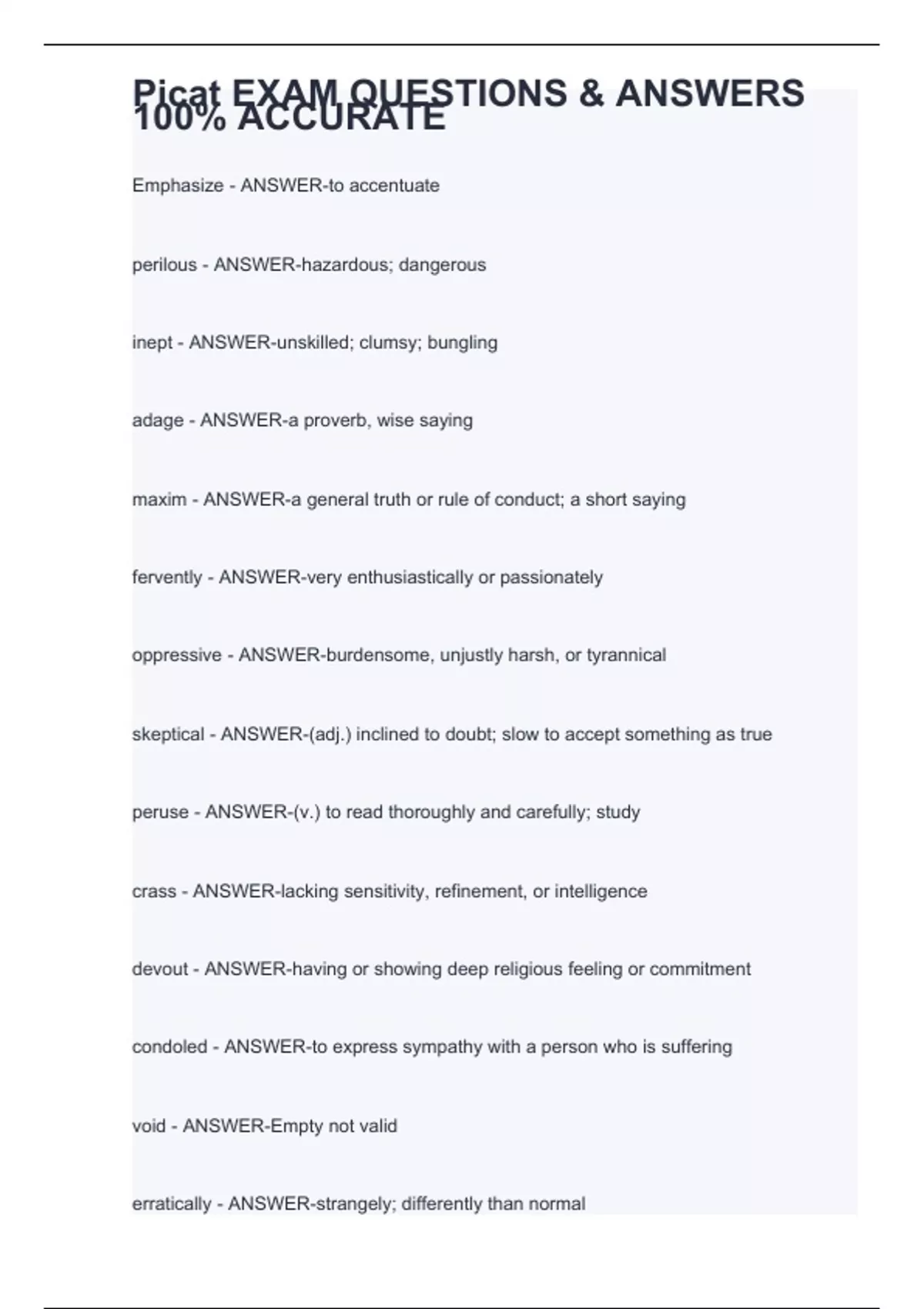 Emphasize - ANSWER-to accentuate perilous - ANSWER-hazardous; dangerous inept - ANSWER-unskilled; clumsy; bungling adage - ANSWER-a proverb, wise saying maxim - ANSWER-a general truth or rule of conduct; a short saying fervently - ANSWER-very enthusiastically or passionately oppressive - ANSWER-burdensome, unjustly harsh, or tyrannical skeptical - ANSWER-(adj.) inclined to doubt; slow to accept something as true peruse - ANSWER-(v.) to read thoroughly and carefully; study crass - ANSWER-lacking sensitivity, refinement, or intelligence devout - ANSWER-having or showing deep religious feeling or commitment condoled - ANSWER-to express sympathy with a person who is suffering