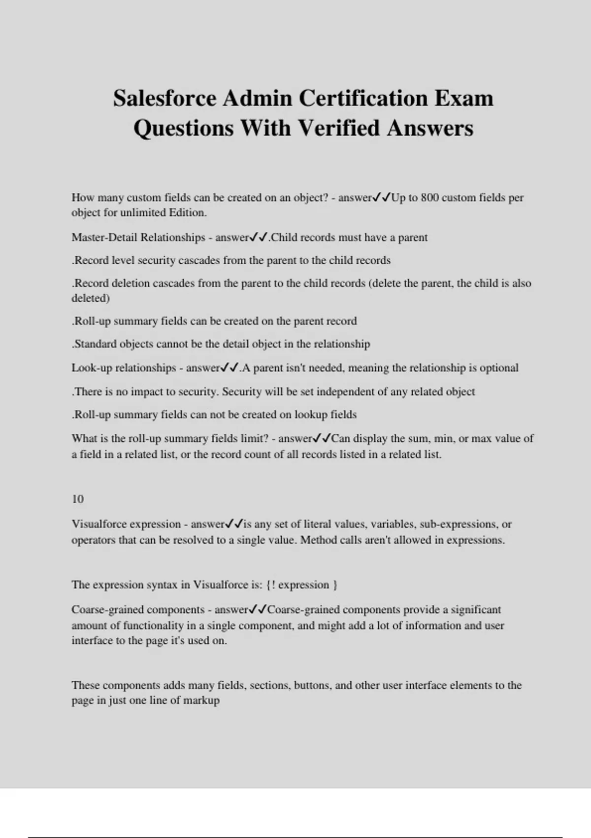 Salesforce Admin Certification Exam Questions With Verified Answers How many custom fields can be created on an object? - answerUp to 800 custom fields per object for unlimited Edition. Master-Detail Relationships - answer.Child records must have a parent .Record level security cascades from the parent to the child records .Record deletion cascades from the parent to the child records (delete the parent, the child is also deleted) .Roll-up summary fields can be created on the parent record .Standard objects cannot be the detail object in the relationship Look-up relationships - answer.A parent isn't needed, meaning the relationship is optional .There is no impact to security. Security will be set independent of any related object .Roll-up summary fields can not be created on lookup fields What is the roll-up summary fields limit? - answerCan display the sum, min, or max value of a field in a related list, or the record count of all records listed in a related list. 10 Visualforce expression - answeris any set of literal values, variables, sub-expressions, or operators that can be resolved to a single value. Method calls aren't allowed in expressions. The expression syntax in Visualforce is: {! expression } Coarse-grained components - answerCoarse-grained components provide a significant amount of functionality in a single component, and might add a lot of information and user interface to the page it's used on. These components adds many fields, sections, buttons, and other user interface elements to the page in just one line of markup Fine-grained components - answerFine-grained components provide more focused functionality, and enable you to design the page to look and behave the way you want. output components - answercomponents that output data from a record and enable you to design a view-only user interface. Sandbox storage limits - answer.Partial Copy sandboxes have a 5 GB of files and a 5 GB of data storage limit. .Developer Pro sandboxes have a 1 GB of files and a 1 GB of data storage limit. .Developer sandboxes have a 200 MB of files and a 200 MB of data storage limit. .Full sandboxes have the same storage limit as your production organization. Standard List Controller - answerThe standard list controller allows you to create Visualforce pages that can display or act on a set of records. Adding the standard list controller to a page is very similar to adding the standard (record) controller, but with the intent of working with many records at once, instead of one record at a time. The standard (record) controller makes it easy to get a single record loaded into a variable you can use on a Visualforce page. The standard list controller is similar, except instead of a single record, it loads a list, or collection, of records into the variable. How do you emulate salesforce1 from your desktop browser? - answerAdd " one/" after your salesforce instance name in the URL. Limitations of dynamic dashboards by Edition - answerEnterprise edition can have up to 5, Unlimited and Performance Edition can have up to 10 and Developer Edition up to 3. What is a controller? - answerControllers typically retrieve the data to be displayed in a Visualforce page, and contain code that executes in response to page actions, such as a button being clicked. The primary purpose of most controllers is to retrieve data for display, or handle updates to data. Describe the action types - answer.Quick actions (New Account, New Event, New Task)