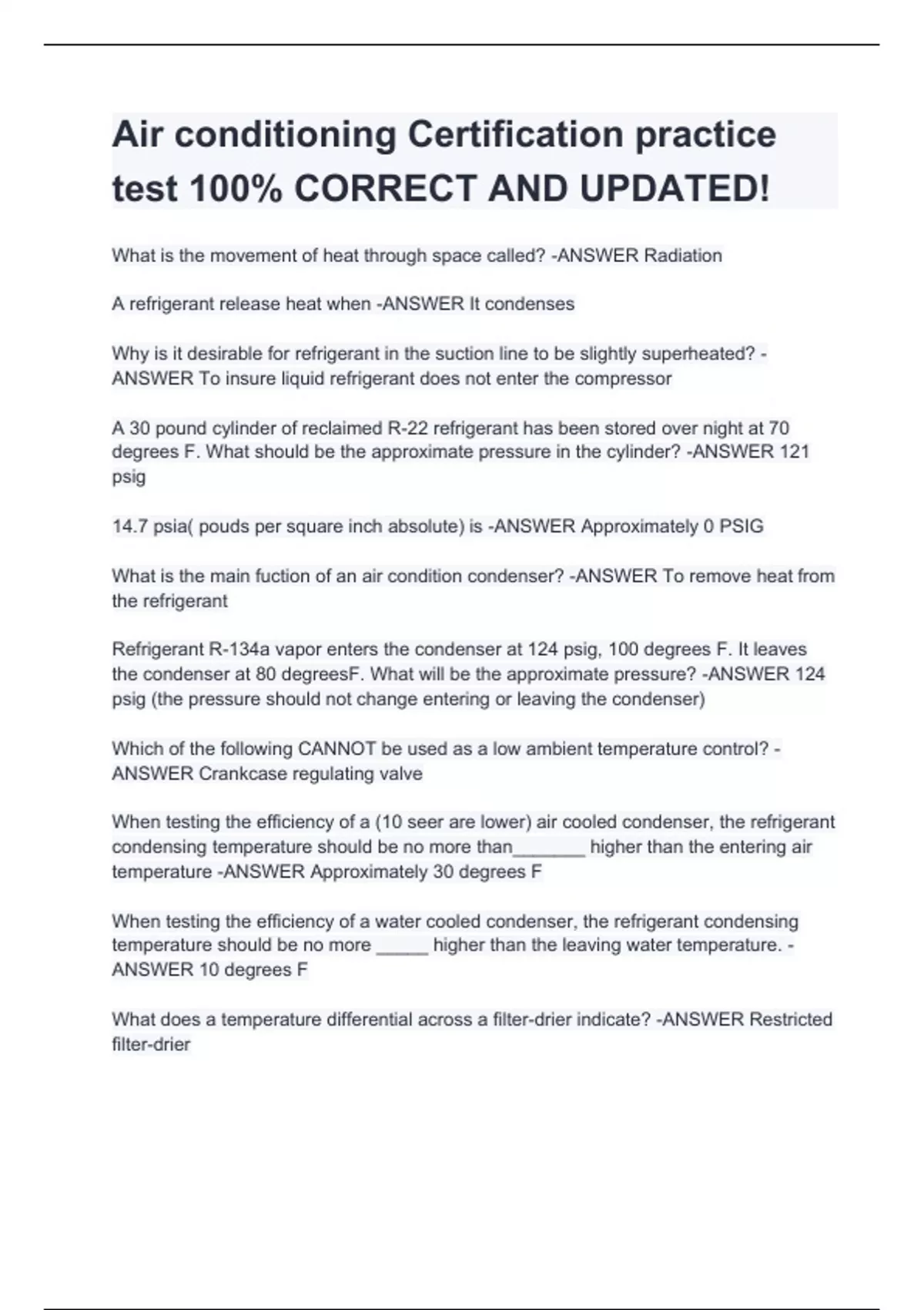 What is the movement of heat through space called? -ANSWER Radiation A refrigerant release heat when -ANSWER It condenses Why is it desirable for refrigerant in the suction line to be slightly superheated? -ANSWER To insure liquid refrigerant does not enter the compressor A 30 pound cylinder of reclaimed R-22 refrigerant has been stored over night at 70 degrees F. What should be the approximate pressure in the cylinder? -ANSWER 121 psig 14.7 psia( pouds per square inch absolute) is -ANSWER Approximately 0 PSIG What is the main fuction of an air condition condenser? -ANSWER To remove heat from the refrigerant Refrigerant R-134a vapor enters the condenser at 124 psig, 100 degrees F. It leaves the condenser at 80 degreesF. What will be the approximate pressure? -ANSWER 124 psig (the pressure should not change entering or leaving the condenser) Which of the following CANNOT be used as a low ambient temperature control? -ANSWER Crankcase regulating valve When testing the efficiency of a (10 seer are lower) air cooled condenser, the refrigerant condensing temperature should be no more than_______ higher than the entering air temperature -ANSWER Approximately 30 degrees F When testing the efficiency of a water cooled condenser, the refrigerant condensing temperature should be no more _____ higher than the leaving water temperature. -ANSWER 10 degrees F