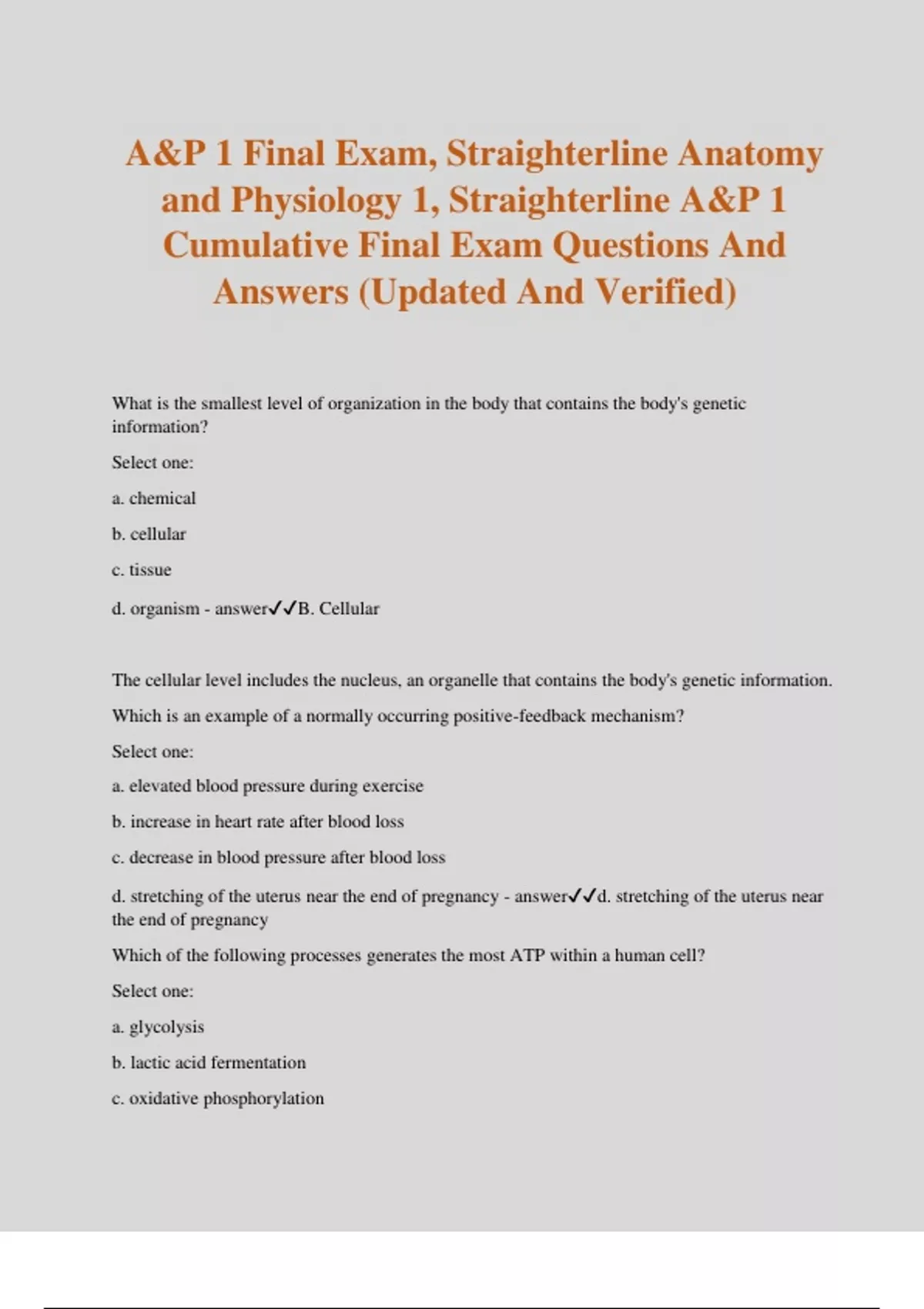 A&P 1 Final Exam, Straighterline Anatomy and Physiology 1, Straighterline A&P 1 Cumulative Final Exam Questions And Answers (Updated And Verified) What is the smallest level of organization in the body that contains the body's genetic information? Select one: a. chemical b. cellular c. tissue d. organism - answerB. Cellular The cellular level includes the nucleus, an organelle that contains the body's genetic information. Which is an example of a normally occurring positive-feedback mechanism? Select one: a. elevated blood pressure during exercise b. increase in heart rate after blood loss c. decrease in blood pressure after blood loss d. stretching of the uterus near the end of pregnancy - answerd. stretching of the uterus near the end of pregnancy Which of the following processes generates the most ATP within a human cell? Select one: a. glycolysis b. lactic acid fermentation c. oxidative phosphorylation d. citric acid cycle - answerc. oxidative phosphorylation During DNA replication, how does each template strand eventually become two identical DNA molecules? Select one: a. The two strands form continuously, catalyzed by DNA polymerase. b. The two strands form continuously, catalyzed by DNA ligase. c. One strand forms continuously, the other forms in short segments spliced by DNA polymerase. d. One strand forms continuously, the other forms in short segments spliced by DNA ligase. - answerd. One strand forms continuously, the other forms in short segments spliced by DNA ligase. Which is the most superficial layer of skin that is composed primarily of living cells? Select one: a. stratum corneum b. stratum lucidum c. stratum basale d. stratum spinosum - answerd. stratum spinosum Which of the following is the definition of a third degree burn? Select one: a. a burn that covers at least 25% of the skin b. a burn that has destroyed the dermis and epidermis c. a burn that can only be caused by fire d. a burn that does not leave scars - answerb. a burn that has destroyed the dermis and epidermis Which of the following types of openings in the skeletal system does a "sinus" describe? Select one: a. cavity b. cleft c. hole d. tunnel - answera. cavity Which of the following components of the bone matrix, when removed, allows the bone to be easily shattered? Select one: a. cartilage b. collagen c. hydroxyapatite d. mineral - answerb. collagen Which of the following is the most widely distributed type of muscle in the body? Select one: a. cardiac b. postural c. skeletal d. smooth - answerd. smooth Which sentence best describes the sliding filament model of muscle contraction? Select one: a. Actin and myosin filaments remain stationary. b. Actin and myosin myofilaments shorten. c. Sarcomeres and myofibrils contract. d. Sarcomeres and myofibrils lengthen. - answerc. Sarcomeres and myofibrils contract. doctor performing an autopsy on a patient concludes that part of the brain was likely damaged by trauma due to a large population of which type of cell? Select one: a. Schwann cells b. microglia c. oligodendrocytes d. ependymal cel - answerb. microglia What type of axons is found in a gray ramus comunicans? Select one: a. myelinated, pre-ganglionic axons b. myelinated, post-ganglionic axons c. unmyelinated, pre-ganglionic axons d. unmyelinated, post-ganglionic axons - answerd. unmyelinated, post-ganglionic axons Which class of chemical messengers is secreted by neurons into synaptic clefts to activate an adjacent cell? Select one: a. autocrine b. endocrine c. neurotransmitter d. paracrine - answerc. neurotransmitter The targeted response of the hormone lipotropin is an increase in which of the following? Select one: a. the breakdown of fat in adipose tissues b. the breakdown of lipids and release of fatty acids from cells c. the production of milk in lactating women d. the secretion of thyroid hormone - answera. the breakdown of fat in adipose tissues The articulations between the radius and ulna that allow for rotation of the forearm is an example of a(n) _________ joint. A. plane B. pivot C. hinge D. ellipsoid - answerB. pivot In order to increase low blood glucose levels back to normal, the pancreas increases secretion of ________. A. somatostatin B. insulin C. glucocorticoids