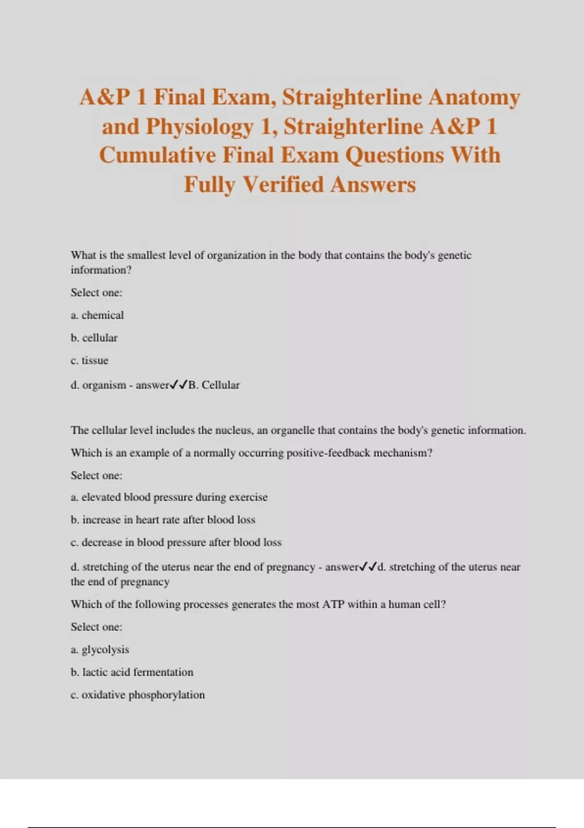 A&P 1 Final Exam, Straighterline Anatomy and Physiology 1, Straighterline A&P 1 Cumulative Final Exam Questions With Fully Verified Answers What is the smallest level of organization in the body that contains the body's genetic information? Select one: a. chemical b. cellular c. tissue d. organism - answerB. Cellular The cellular level includes the nucleus, an organelle that contains the body's genetic information. Which is an example of a normally occurring positive-feedback mechanism? Select one: a. elevated blood pressure during exercise b. increase in heart rate after blood loss c. decrease in blood pressure after blood loss d. stretching of the uterus near the end of pregnancy - answerd. stretching of the uterus near the end of pregnancy Which of the following processes generates the most ATP within a human cell? Select one: a. glycolysis b. lactic acid fermentation c. oxidative phosphorylation d. citric acid cycle - answerc. oxidative phosphorylation During DNA replication, how does each template strand eventually become two identical DNA molecules? Select one: a. The two strands form continuously, catalyzed by DNA polymerase. b. The two strands form continuously, catalyzed by DNA ligase. c. One strand forms continuously, the other forms in short segments spliced by DNA polymerase. d. One strand forms continuously, the other forms in short segments spliced by DNA ligase. - answerd. One strand forms continuously, the other forms in short segments spliced by DNA ligase. Which is the most superficial layer of skin that is composed primarily of living cells? Select one: a. stratum corneum b. stratum lucidum c. stratum basale d. stratum spinosum - answerd. stratum spinosum Which of the following is the definition of a third degree burn? Select one: a. a burn that covers at least 25% of the skin b. a burn that has destroyed the dermis and epidermis c. a burn that can only be caused by fire d. a burn that does not leave scars - answerb. a burn that has destroyed the dermis and epidermis Which of the following types of openings in the skeletal system does a "sinus" describe? Select one: a. cavity b. cleft c. hole d. tunnel - answera. cavity Which of the following components of the bone matrix, when removed, allows the bone to be easily shattered? Select one: a. cartilage b. collagen c. hydroxyapatite d. mineral - answerb. collagen Which of the following is the most widely distributed type of muscle in the body? Select one: a. cardiac b. postural c. skeletal d. smooth - answerd. smooth Which sentence best describes the sliding filament model of muscle contraction? Select one: a. Actin and myosin filaments remain stationary. b. Actin and myosin myofilaments shorten. c. Sarcomeres and myofibrils contract. d. Sarcomeres and myofibrils lengthen. - answerc. Sarcomeres and myofibrils contract. doctor performing an autopsy on a patient concludes that part of the brain was likely damaged by trauma due to a large population of which type of cell? Select one: a. Schwann cells b. microglia c. oligodendrocytes d. ependymal cel - answerb. microglia What type of axons is found in a gray ramus comunicans? Select one: a. myelinated, pre-ganglionic axons b. myelinated, post-ganglionic axons c. unmyelinated, pre-ganglionic axons d. unmyelinated, post-ganglionic axons - answerd. unmyelinated, post-ganglionic axons Which class of chemical messengers is secreted by neurons into synaptic clefts to activate an adjacent cell? Select one: a. autocrine b. endocrine c. neurotransmitter d. paracrine - answerc. neurotransmitter The targeted response of the hormone lipotropin is an increase in which of the following? Select one: a. the breakdown of fat in adipose tissues b. the breakdown of lipids and release of fatty acids from cells c. the production of milk in lactating women d. the secretion of thyroid hormone - answera. the breakdown of fat in adipose tissues The articulations between the radius and ulna that allow for rotation of the forearm is an example of a(n) _________ joint. A. plane B. pivot C. hinge D. ellipsoid - answerB. pivot In order to increase low blood glucose levels back to normal, the pancreas increases secretion of ________. A. somatostatin B. insulin C. glucocorticoids
