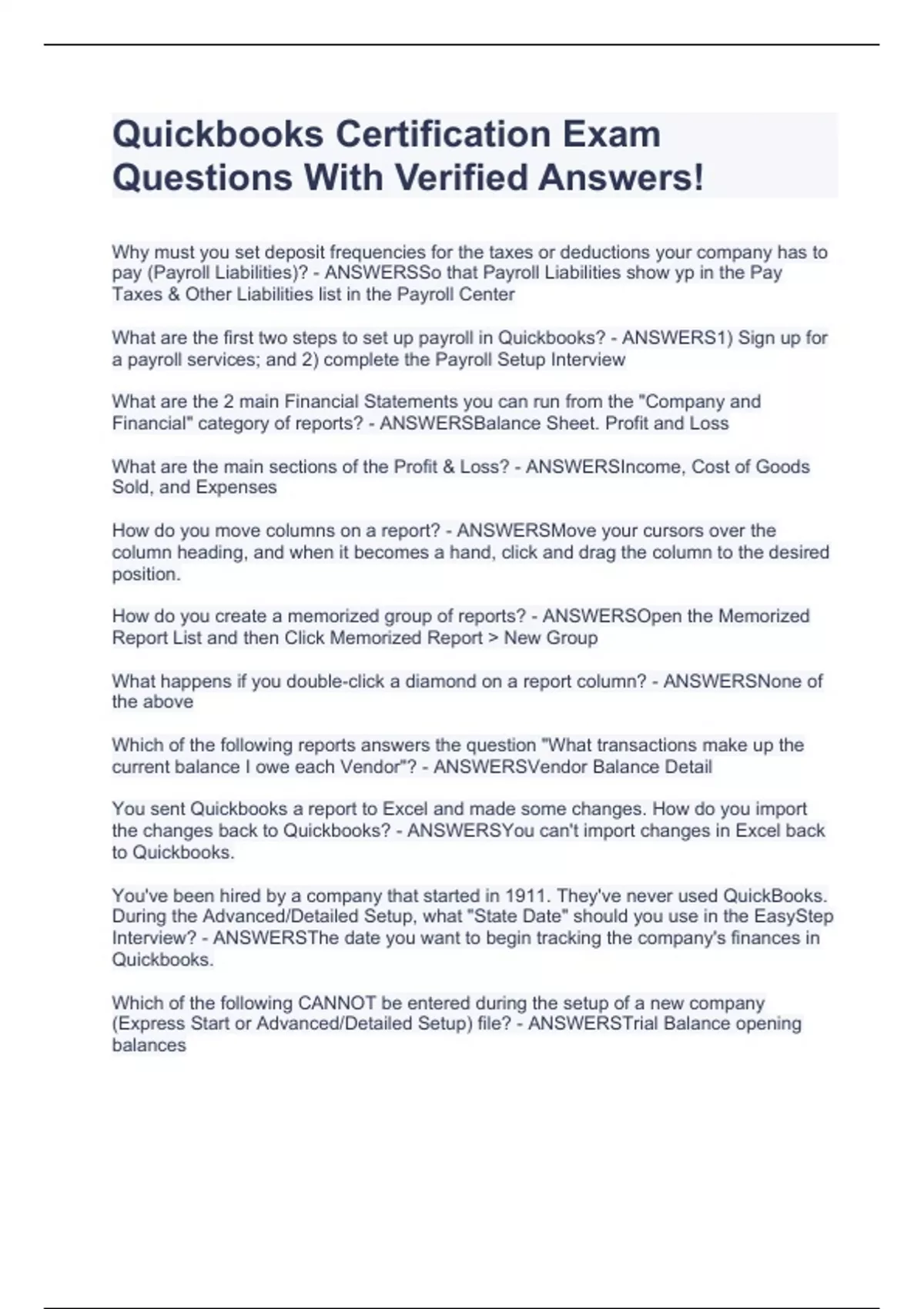 Why must you set deposit frequencies for the taxes or deductions your company has to pay (Payroll Liabilities)? - ANSWERSSo that Payroll Liabilities show yp in the Pay Taxes & Other Liabilities list in the Payroll Center What are the first two steps to set up payroll in Quickbooks? - ANSWERS1) Sign up for a payroll services; and 2) complete the Payroll Setup Interview What are the 2 main Financial Statements you can run from the "Company and Financial" category of reports? - ANSWERSBalance Sheet. Profit and Loss What are the main sections of the Profit & Loss? - ANSWERSIncome, Cost of Goods Sold, and Expenses How do you move columns on a report? - ANSWERSMove your cursors over the column heading, and when it becomes a hand, click and drag the column to the desired position. How do you create a memorized group of reports? - ANSWERSOpen the Memorized Report List and then Click Memorized Report > New Group What happens if you double-click a diamond on a report column? - ANSWERSNone of the above Which of the following reports answers the question "What transactions make up the current balance I owe each Vendor"? - ANSWERSVendor Balance Detail You sent Quickbooks a report to Excel and made some changes. How do you import the changes back to Quickbooks? - ANSWERSYou can't import changes in Excel back to Quickbooks. You've been hired by a company that started in 1911. They've never used QuickBooks. During the Advanced/Detailed Setup, what "State Date" should you use in the EasyStep Interview? - ANSWERSThe date you want to begin tracking the company's finances in Quickbooks. Which of the following CANNOT be entered during the setup of a new company (Express Start or Advanced/Detailed Setup) file? - ANSWERSTrial Balance opening balances How do you customize Quickbooks by changing the color scheme and adding or r