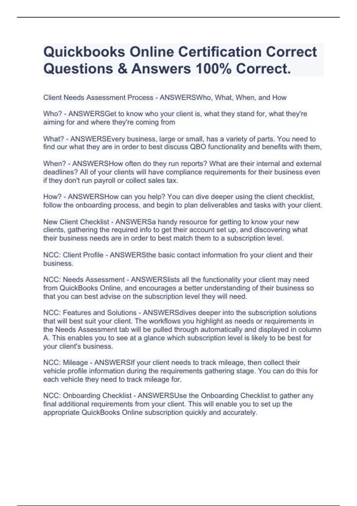Quickbooks Online Certification Correct Questions & Answers 100% Correct.