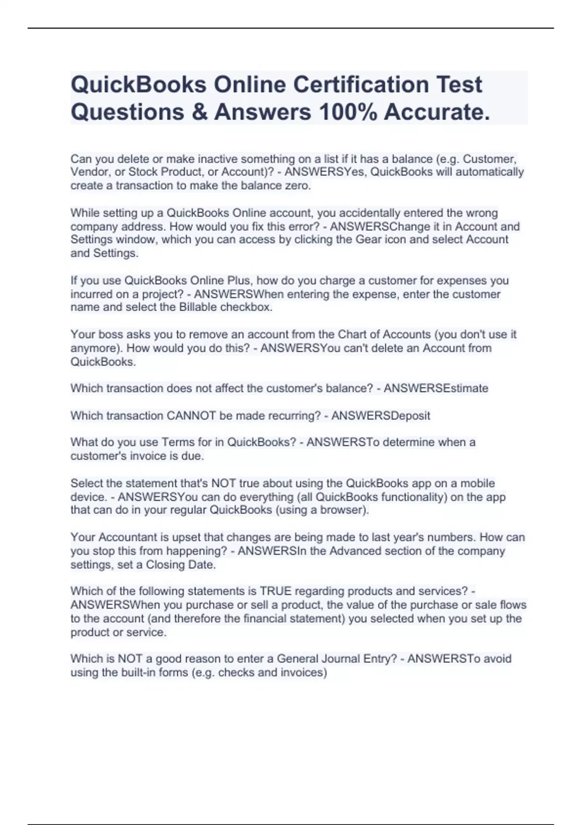 Can you delete or make inactive something on a list if it has a balance (e.g. Customer, Vendor, or Stock Product, or Account)? - ANSWERSYes, QuickBooks will automatically create a transaction to make the balance zero. While setting up a QuickBooks Online account, you accidentally entered the wrong company address. How would you fix this error? - ANSWERSChange it in Account and Settings window, which you can access by clicking the Gear icon and select Account and Settings. If you use QuickBooks Online Plus, how do you charge a customer for expenses you incurred on a project? - ANSWERSWhen entering the expense, enter the customer name and select the Billable checkbox. Your boss asks you to remove an account from the Chart of Accounts (you don't use it anymore). How would you do this? - ANSWERSYou can't delete an Account from QuickBooks. Which transaction does not affect the customer's balance? - ANSWERSEstimate Which transaction CANNOT be made recurring? - ANSWERSDeposit What do you use Terms for in QuickBooks? - ANSWERSTo determine when a customer's invoice is due. Select the statement that's NOT true about using the QuickBooks app on a mobile device. - ANSWERSYou can do everything (all QuickBooks functionality) on the app that can do in your regular QuickBooks (using a browser). Your Accountant is upset that changes are being made to last year's numbers. How can you stop this from happening? - ANSWERSIn the Advanced section of the company settings, set a Closing Date. Which of the following statements is TRUE regarding products and services? - ANSWERSWhen you purchase or sell a product, the value of the purchase or sale flows to the account (and therefore the financial statement) you selected when you set up the product or service. Which is NOT a good reason to enter a General Journal Entry? - ANSWERSTo avoid using the built-in forms (e.g. checks and invoices)