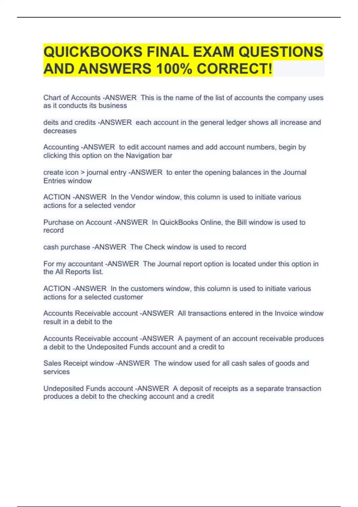 Chart of Accounts -ANSWER This is the name of the list of accounts the company uses as it conducts its business deits and credits -ANSWER each account in the general ledger shows all increase and decreases Accounting -ANSWER to edit account names and add account numbers, begin by clicking this option on the Navigation bar create icon > journal entry -ANSWER to enter the opening balances in the Journal Entries window ACTION -ANSWER In the Vendor window, this column is used to initiate various actions for a selected vendor Purchase on Account -ANSWER In QuickBooks Online, the Bill window is used to record cash purchase -ANSWER The Check window is used to record For my accountant -ANSWER The Journal report option is located under this option in the All Reports list. ACTION -ANSWER In the customers window, this column is used to initiate various actions for a selected customer Accounts Receivable account -ANSWER All transactions entered in the Invoice window result in a debit to the Accounts Receivable account -ANSWER A payment of an account receivable produces a debit to the Undeposited Funds account and a credit to Sales Receipt window -ANSWER The window used for all cash sales of goods and services Undeposited Funds account -ANSWER A deposit of receipts as a separate transaction produces a debit to the checking account and a credit