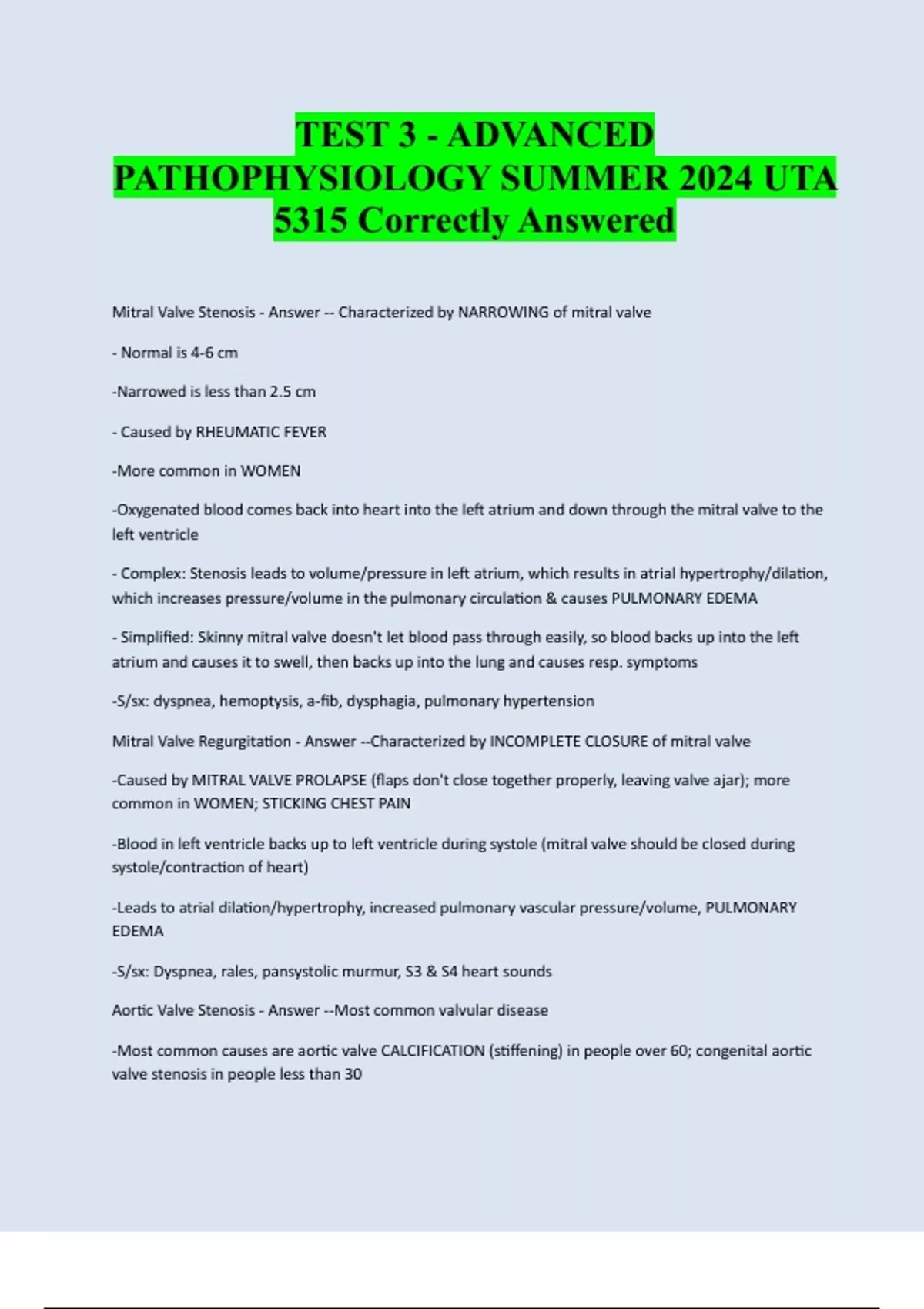 TEST 3 - ADVANCED PATHOPHYSIOLOGY SUMMER 2024 UTA 5315 Correctly Answered Mitral Valve Stenosis - Answer -- Characterized by NARROWING of mitral valve - Normal is 4-6 cm -Narrowed is less than 2.5 cm - Caused by RHEUMATIC FEVER -More common in WOMEN -Oxygenated blood comes back into heart into the left atrium and down through the mitral valve to the left ventricle - Complex: Stenosis leads to volume/pressure in left atrium, which results in atrial hypertrophy/dilation, which increases pressure/volume in the pulmonary circulation & causes PULMONARY EDEMA - Simplified: Skinny mitral valve doesn't let blood pass through easily, so blood backs up into the left atrium and causes it to swell, then backs up into the lung and causes resp. symptoms -S/sx: dyspnea, hemoptysis, a-fib, dysphagia, pulmonary hypertension Mitral Valve Regurgitation - Answer --Characterized by INCOMPLETE CLOSURE of mitral valve -Caused by MITRAL VALVE PROLAPSE (flaps don't close together properly, leaving valve ajar); more common in WOMEN; STICKING CHEST PAIN -Blood in left ventricle backs up to left ventricle during systole (mitral valve should be closed during systole/contraction of heart) -Leads to atrial dilation/hypertrophy, increased pulmonary vascular pressure/volume, PULMONARY EDEMA -S/sx: Dyspnea, rales, pansystolic murmur, S3 & S4 heart sounds Aortic Valve Stenosis - Answer --Most common valvular disease -Most common causes are aortic valve CALCIFICATION (stiffening) in people over 60; congenital aortic valve stenosis in people less than 30-Normal valve 3 cm; symptoms seen when valve less than 1 cm; severe when valve is less than 0.5 cm -Narrowed valve prevents outflow from left ventricle to aorta. This backs up blood to the left atrium and ultimately floods the lung causing PULMONARY EDEMA S/Sx: Pulmonary hypertension/edema, poor outflow of aorta to body (aorta sends out oxygenated blood to body), causing fainting or chest pain Simplified: Aorta is stiff and can't send out oxygenated blood properly to the body, depriving tissues of oxygen. Blood gets backed up into lungs, causing pulmonary edema. Aortic Valve Regurgitation - Answer --Valve is TOO WIDE or TOO NARROW, blood doesn't pass through effectively, causing back flow of blood into the left ventricle -Marked by EARLY DIASTOLIC MURMUR (on systole, heart contracts and pushes blood up the aorta, bu