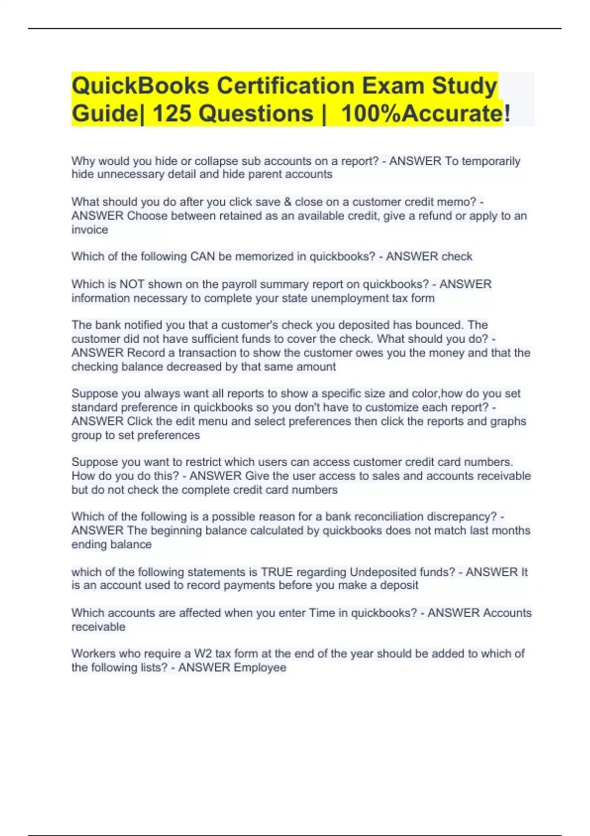 QuickBooks Certification Exam Study Guide| 125 Questions | 100%Accurate!