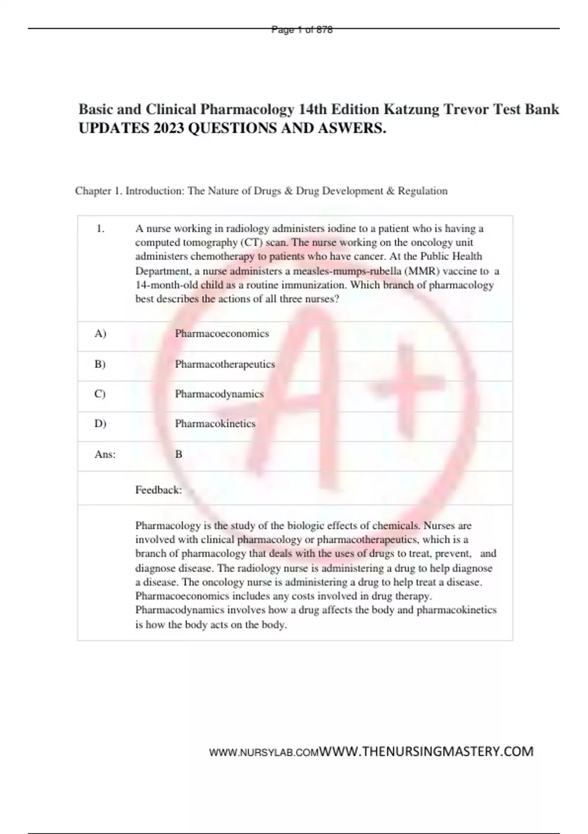 Basic and Clinical Pharmacology 14th Edition Katzung Trevor Test Bank UPDATES 2023 QUESTIONS AND ASWERS. Chapter 1. Introduction: The Nature of Drugs & Drug Development & Regulation 1. A nurse working in radiology administers iodine to a patient who is having a computed tomography (CT) scan. The nurse working on the oncology unit administers chemotherapy to patients who have cancer. At the Public Health Department, a nurse administers a measles-mumps-rubella (MMR) vaccine to a 14-month-old child as a routine immunization. Which branch of pharmacology best describes the actions of all three nurses? A) Pharmacoeconomics B) Pharmacotherapeutics C) Pharmacodynamics D) Pharmacokinetics Ans: B Feedback: Pharmacology is the study of the biologic effects of chemicals. Nurses are involved with clinical pharmacology or pharmacotherapeutics, which is a branch of pharmacology that deals with the uses of drugs to treat, prevent, and diagnose disease. The radiology nurse is administering a drug to help diagnose a disease. The oncology nurse is administering a drug to help treat a disease. Pharmacoeconomics includes any costs involved in drug therapy. Pharmacodynamics involves how a drug affects the body and pharmacokinetics is how the body acts on the body. Page 2 of 878 WWW.NURSYLAB.COMWWW.THENURSINGMASTERY.COM 2. A physician has ordered intramuscular (IM) injections of morphine, a narcotic, every 4 hours as needed for pain in a motor vehicle accident victim. The nurse is aware this drug has a high abuse potential. Under what category would morphine be classified? A) Schedule I B) Schedule II C) Schedule III D) Schedule IV Ans: B Feedback: Narcotics with a high abuse potential are classified as Schedule II drugs because of severe dependence liability. Schedule I drugs have high abuse potential and no accepted medical use. Schedule III drugs have a lesser abuse potential than II and an accepted medical use. Schedule IV drugs have low abuse potential and limited dependence liability. 3. When involved in phase III drug evaluation studies, what responsibilities would the nurse have? A) Working with animals who are given experimental drugs B) Choosing appropriate patients to be involved in the drug study C) Monitoring and observing patients closely for adverse effects D) Conducting research to determine effectiveness of the drug Ans: C Feedback: Page 3 of 878 WWW.NURSYLAB.COMWWW.THENURSINGMASTERY.COM Phase III studies involve use of a drug in a vast clinical population in which patients are asked to record any symptoms they experience while taking the drugs. Nurses may be responsible for helping collect and analyze the information to be shared with the Food and Drug Administration (FDA) but would not conduct research independently because nurses do not prescribe medications. Use of animals in drug testing is done in the preclinical trials. Select patients who are involved in phase II studies to participate in studies where the participants have the disease the drug is intended to treat. These patients are monitored closely for drug action and adverse effects. Phase I studies involve healthy human volunteers who are usually paid for their participation. Nurses may observe for adverse effects and toxicity. 4. What concept is considered when generic drugs are substituted for brand name drugs? A) Bioavailability B) Critical concentration C) Distribution D) Half-life Ans: A Feedback: Bioavailability is the portion of a dose of a drug that reaches the systemic circulation and is available to act on body cells. Binders used in a generic drug may not be the same as those used in the brand name drug. Therefore, the way the body breaks down and uses the drug may differ, which may eliminate a generic drug substitution. Critical concentration is the amount of a drug that is needed to cause a therapeutic effect and should not differ between generic and brand name medications. Distribution is the phase of pharmacokinetics, which involves the movement of a drug to the bodys tissues and is the same in generic and brand name drugs. A drugs half-life is the time it takes for the amount of drug to decrease to half the peak level, which should not change when substituting a generic medication. Page 4 of 878 WWW.NURSYLAB.COMWWW.THENURSINGMASTERY.COM 5. A nurse is assessing the patients home medication use. After listening to the patient list current medications, the nurse asks what priority question? A) Do you take any generic medications? B) Are any of these medications orphan drugs? C) Are these medications safe to take during pregnancy? D) Do you take any over-the-counter medications? Ans: D Feedback: It is important for the nurse to specifically question use of over-the-counter medications because patients may not consider them important. The patient is unlikely to know the meaning of orphan drugs unless they too are health care providers. Safety during pregnancy, use of a generic medication, or classification of orphan drugs are things the patient would be unable to answer but could be found in reference books if the nurse wishes to research them. 6. After completing a course on pharmacology for nurses, what will the nurse know? A) Everything necessary for safe and effective medication administration B) Current pharmacologic therapy; the nurse will not require ongoing education for 5 years. C) General drug information; the nurse can consult a drug guide for specific drug information. D) The drug actions that are associated with each classification of medication Ans: C Feedback: Page 5 of 878 WWW.NURSYLAB.COMWWW.THENURSINGMASTERY.COM After completing a pharmacology course nurses will have general drug information needed for safe and effective medication administration but will need to consult a drug guide for specific drug information before administering any medication. Pharmacology is constantly changing, with new drugs entering the market and new uses for existing drugs identified. Continuing education in pharmacology 