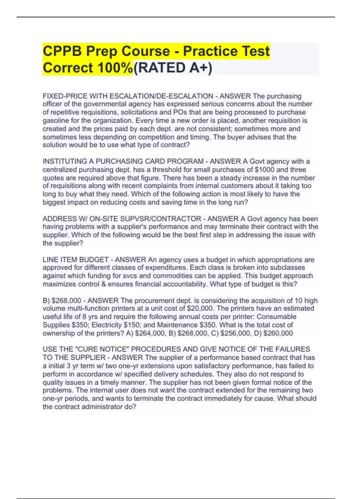 FIXED-PRICE WITH ESCALATION/DE-ESCALATION - ANSWER The purchasing officer of the governmental agency has expressed serious concerns about the number of repetitive requisitions, solicitations and POs that are being processed to purchase gasoline for the organization. Every time a new order is placed, another requisition is created and the prices paid by each dept. are not consistent; sometimes more and sometimes less depending on competition and timing. The buyer advises that the solution would be to use what type of contract? INSTITUTING A PURCHASING CARD PROGRAM - ANSWER A Govt agency with a centralized purchasing dept. has a threshold for small purchases of $1000 and three quotes are required above that figure. There has been a steady increase in the number of requisitions along with recent complaints from internal customers about it taking too long to buy what they need. Which of the following action is most likely to have the biggest impact on reducing costs and saving time in the long run? ADDRESS W/ ON-SITE SUPVSR/CONTRACTOR - ANSWER A Govt agency has been having problems with a supplier's performance and may terminate their contract with the supplier. Which of the following would be the best first step in addressing the issue with the supplier? LINE ITEM BUDGET - ANSWER An agency uses a budget in which appropriations are approved for different classes of expenditures. Each class is broken into subclasses against which funding for svcs and commodities can be applied. This budget approach maximizes control & ensures financial accountability. What type of budget is this? B) $268,000 - ANSWER The procurement dept. is considering the acquisition of 10 high volume multi-function printers at a unit cost of $20,000. The printers have an estimated useful life of 8 yrs and require the following annual costs per printer: Consumable Supplies $350; Electricity $150; and Maintenance $350. What is the total cost of ownership of the printers? A) $264,000, B) $268,000, C) $256,000, D) $260,000 USE THE "CURE NOTICE" PROCEDURES AND GIVE NOTICE OF THE FAILURES TO THE SUPPLIER - ANSWER The supplier of a performance based contract that has a initial 3 yr term w/ two one-yr extensions upon satisfactory performance, has failed to perform in accordance w/ specified delivery schedules. They also do not respond to quality issues in a timely manner. The supplier has not been given formal notice of the problems. The internal user does not want the contract extended for the remaining two one-yr periods, and wants to terminate the contract immediately for cause. What should the contract administrator do? D)