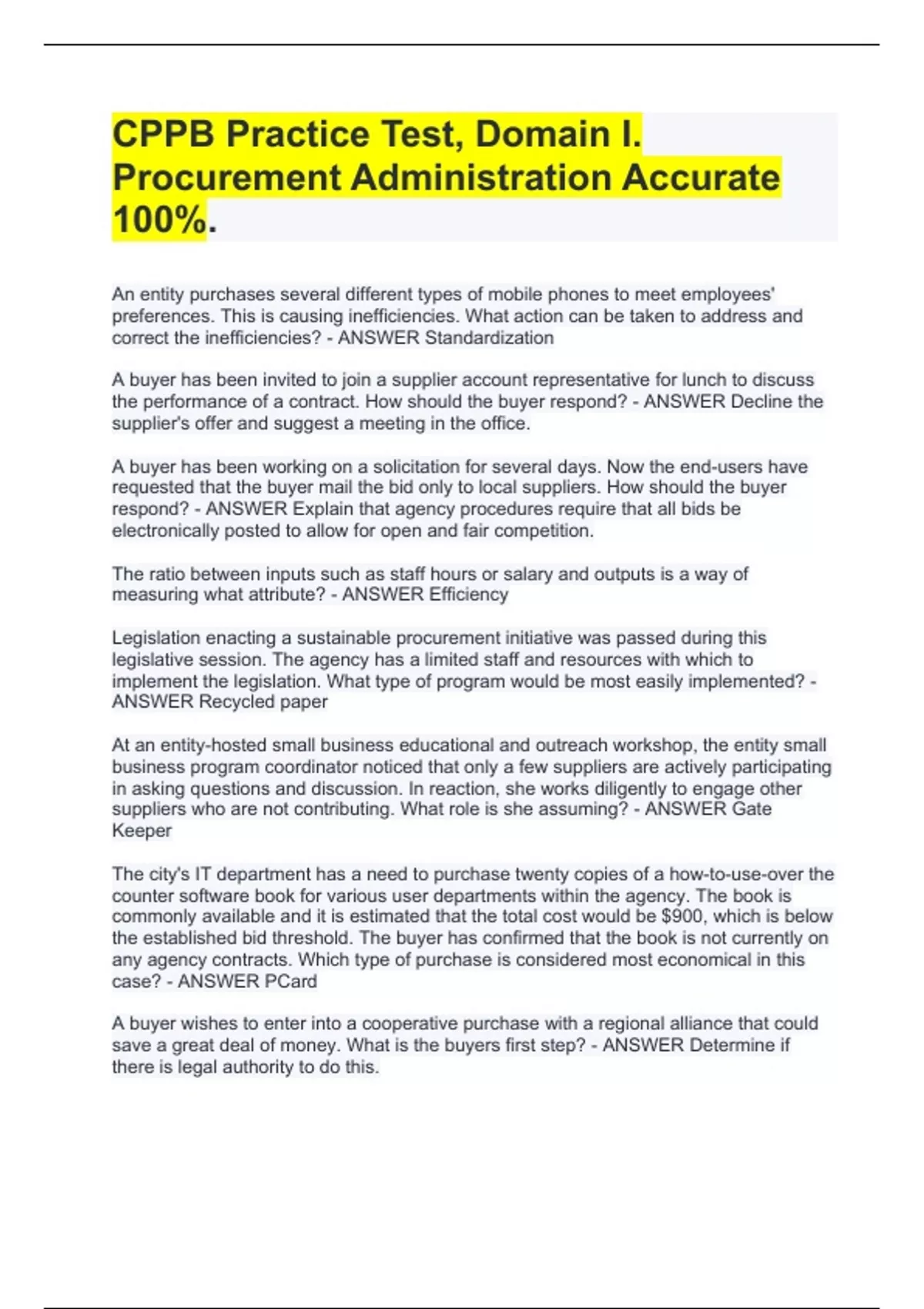 CPPB Practice Test, Domain I. Procurement Administration Accurate 100%.