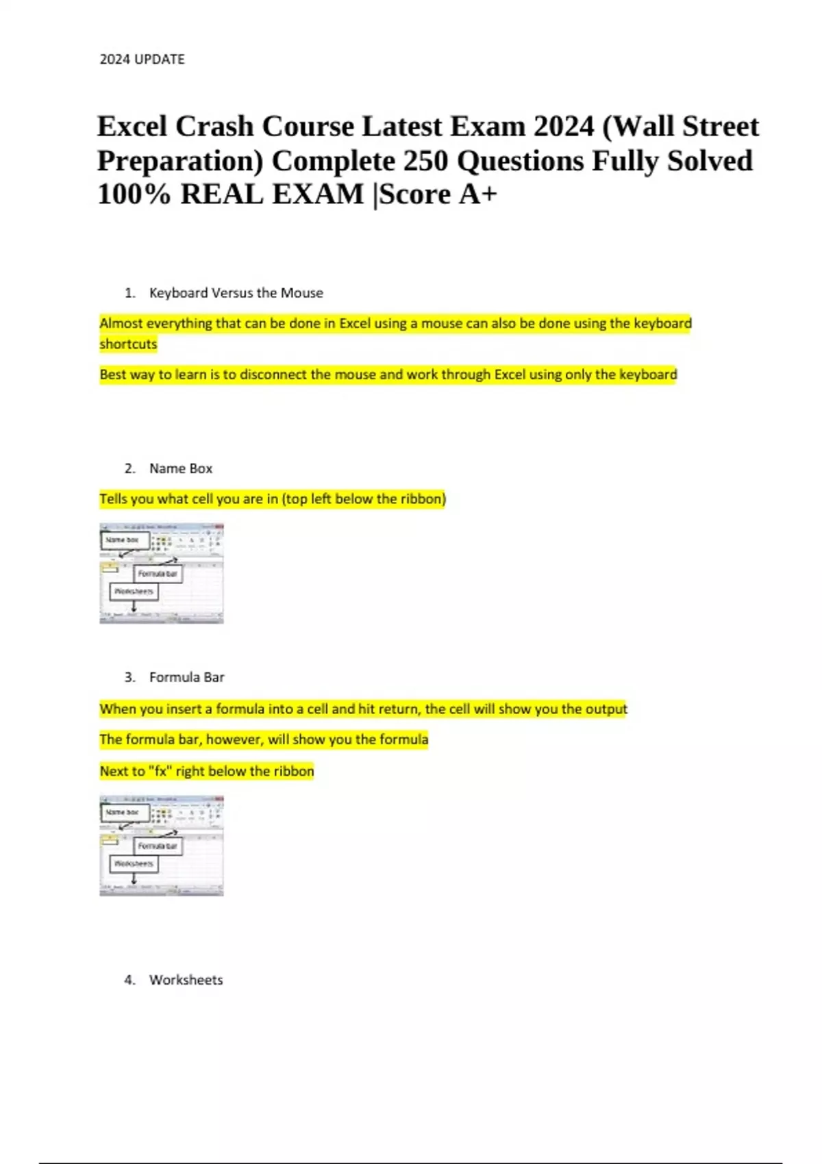 Excel Crash Course Latest Exam 2024 (Wall Street Preparation) Complete 250 Questions Fully Solved 100% REAL EXAM |Score A+. 1. Keyboard Versus the Mouse Almost everything that can be done in Excel using a mouse can also be done using the keyboard shortcuts Best way to learn is to disconnect the mouse and work through Excel using only the keyboard 2. Name Box Tells you what cell you are in (top left below the ribbon) 3. Formula Bar When you insert a formula into a cell and hit return, the cell will show you the output The formula bar, however, will show you the formula Next to "fx" right below the ribbon 4. Worksheets Excel Crash Course Latest Exam 2024 (Wall Street Preparation) Complete 250 Questions Fully Solved 100% REAL EXAM |Score A+ 2024 UPDATE An Excel file is called a workbook; You start with 1 worksheet but you can add/delete more The active worksheet is highlighted in Excel 5. Moving Between Worksheets Ctrl + PageDown/PageUp (Option + RightArrow/LeftArrow) 6. Adding Worksheets (Fn Shift F11) 7. Columns Alphabetically labeled (A, B, C, etc.) 8. Rows Numerically labeled (1, 2, 3, etc.) 2024 UPDATE 9. Main tabs Although we focus on shortcuts, virtually all commands, functions, and Excel features can be accessed through the task-oriented tabs which organize them into nine logical categories: (1) Home (2) Insert (3) Draw (4) Page Layout (5) Formulas (6) Data (7) Review (8) View (9) Developer 10. How to Access Ribbon on Mac Ctrl Fn F2 Use arrow keys to peruse the Mac ribbon 11. Mac Settings to Disable 2024 UPDATE (1) Function Keys: Settings - Keyboard - Use F1, F2, etc. keys as standard function keys (2) Mission Control: System Preferences - Keyboard - Shortcuts - Mission Control - Disable "Move a space left" and "Move a space right" to use Ctrl RightArrow or Ctrl LeftArrow 12. Using Function Keys Hit Fn and then the function key to use the function keys themselves on a Mac 13. Open a New Workout Ctrl N Cmnd N 14. The File Tab Many Excel features (Open file, Save file, Print file, etc.) are located in this tab Excel also has alternative keyboard shortcuts (using Ctrl) for many of these features Open a File: Ctrl O (Cmnd O) Save a File: Ctrl S (Cmnd S) Print a File: Ctrl P (Cmnd P) 15. Save a File Ctrl S Cmnd S 16. Print a File Ctrl P 2024 UPDATE Cmnd P 17. Open a File Ctrl O Cmnd O 18. Toolbars Within each of the main tabs you will find all of Excel's features, grouped by commands 19. Navigating to the Toolbars Without the Mouse Hit Alt and the appropriate letter (or use the right/left arrow keys) to get to the desired tab Once there, use the Tab and Shift Tab keys to navigate around, the Space to open a drop down, and Enter to select 20. Bold Command Ctrl B Cmnd B.