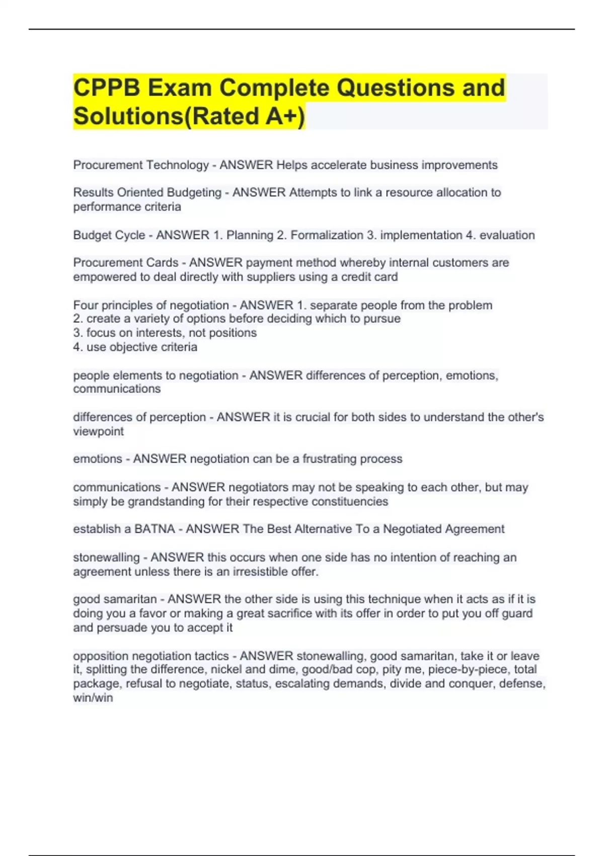 Procurement Technology - ANSWER Helps accelerate business improvements Results Oriented Budgeting - ANSWER Attempts to link a resource allocation to performance criteria Budget Cycle - ANSWER 1. Planning 2. Formalization 3. implementation 4. evaluation Procurement Cards - ANSWER payment method whereby internal customers are empowered to deal directly with suppliers using a credit card Four principles of negotiation - ANSWER 1. separate people from the problem 2. create a variety of options before deciding which to pursue 3. focus on interests, not positions 4. use objective criteria people elements to negotiation - ANSWER differences of perception, emotions, communications differences of perception - ANSWER it is crucial for both sides to understand the other's viewpoint emotions - ANSWER negotiation can be a frustrating process communications - ANSWER negotiators may not be speaking to each other, but may simply be grandstanding for their respective constituencies establish a BATNA - ANSWER The Best Alternative To a Negotiated Agreement stonewalling - ANSWER this occurs when one side has no intention of reaching an agreement unless there is an irresistible offer. good samaritan - ANSWER the other side is using this technique when it acts as if it is do