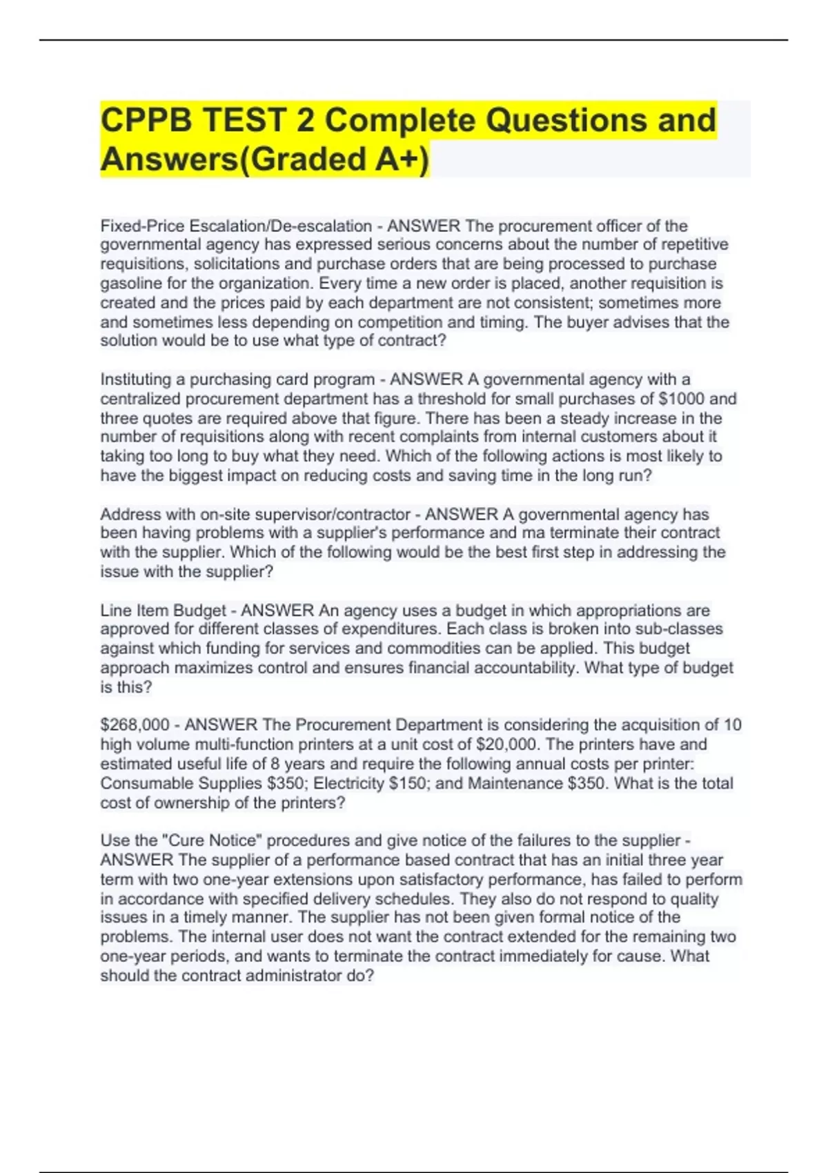 Fixed-Price Escalation/De-escalation - ANSWER The procurement officer of the governmental agency has expressed serious concerns about the number of repetitive requisitions, solicitations and purchase orders that are being processed to purchase gasoline for the organization. Every time a new order is placed, another requisition is created and the prices paid by each department are not consistent; sometimes more and sometimes less depending on competition and timing. The buyer advises that the solution would be to use what type of contract? Instituting a purchasing card program - ANSWER A governmental agency with a centralized procurement department has a threshold for small purchases of $1000 and three quotes are required above that figure. There has been a steady increase in the number of requisitions along with recent complaints from internal customers about it taking too long to buy what they need. Which of the following actions is most likely to have the biggest impact on reducing costs and saving time in the long run? Address with on-site supervisor/contractor - ANSWER A governmental agency has been having problems with a supplier's performance and ma terminate their contract with the supplier. Which of the following would be the best first step in addressing the issue with the supplier? Line Item Budget - ANSWER An agency uses a budget in which appropriations are approved for different classes of expenditures. Each class is broken into sub-classes against which funding for services and commodities can be applied. This budget approach maximizes control and ensures financial accountability. What type of budget is this? $268,000 - ANSWER The Procurement Department is considering the acquisition of 10 high volume multi-function printers at a unit cost of $20,000. The printers have and estimated useful life of 8 years and require the following annual costs per printer: Consumable Supplies $350; Electricity $150; and Maintenance $350. What is the total cost of ownership of the printers? Use the "Cure Notice" procedures and give notice of the failures to the supplier - ANSWER The supplier of a performance based contract that has an initial three year term with two one-year extensions upon satisfactory performance, has failed to perform in accordance with specified delivery schedules. They also do not respond to quality issues in a timely manner. The supplier has not been given formal notice of the problems. The internal user does not want the contract extended for the remaining two one-year periods, and wants to terminate the contract immediately for cause. What should the contract administrator do? Forming - ANSWER The members of the team are getting to know one another and learning about the knowledge and skills that each brings to th e team