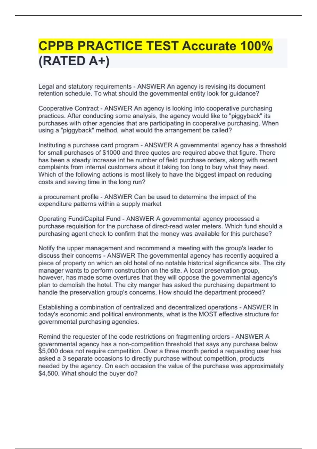 Legal and statutory requirements - ANSWER An agency is revising its document retention schedule. To what should the governmental entity look for guidance? Cooperative Contract - ANSWER An agency is looking into cooperative purchasing practices. After conducting some analysis, the agency would like to "piggyback" its purchases with other agencies that are participating in cooperative purchasing. When using a "piggyback" method, what would the arrangement be called? Instituting a purchase card program - ANSWER A governmental agency has a threshold for small purchases of $1000 and three quotes are required above that figure. There has been a steady increase int he number of field purchase orders, along with recent complaints from internal customers about it taking too long to buy what they need. Which of the following actions is most likely to have the biggest impact on reducing costs and saving time in the long run? a procurement profile - ANSWER Can be used to determine the impact of the expenditure patterns within a supply market Operating Fund/Capital Fund - ANSWER A governmental agency processed a purchase requisition for the purchase of direct-read water meters. Which fund should a purchasing agent check to confirm that the money was available for this purchase? Notify the upper management and recommend a meeting with the group's leader to discuss their concerns - ANSWER The governmental agency has recently acquired a piece of property on which an old hotel of no notable historical significance sits. The city manager wants to perform construction on the site. A local preservation group, however, has made some overtures that they will oppose the governmental agency's plan to demolish the hotel. The city manger has asked the purchasing department to handle the preservation group's concerns. How should the department proceed? Establishing a combination of centralized and decentralized operations - ANSWER In today's economic and political environments, what is the MOST effective structure for governmental purchasing agencies. Remind the requester of the code restrictions on fragmenting orders - ANSWER A governmental agency has a non-competition threshold that says any purchase below $5,000 does not require competition. Over a three month period a requesting user has asked a 3 separate occasions to directly purchase without competition, products needed by the agency. On each occasion the value of the purchase was approximately $4,50