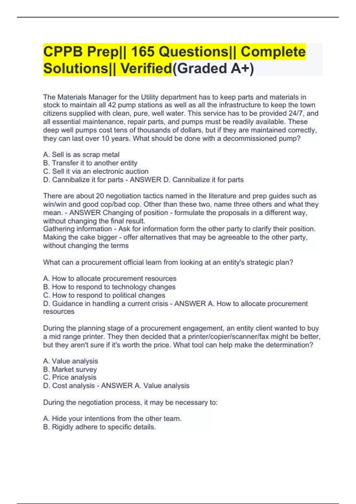 The Materials Manager for the Utility department has to keep parts and materials in stock to maintain all 42 pump stations as well as all the infrastructure to keep the town citizens supplied with clean, pure, well water. This service has to be provided 24/7, and all essential maintenance, repair parts, and pumps must be readily available. These deep well pumps cost tens of thousands of dollars, but if they are maintained correctly, they can last over 10 years. What should be done with a decommissioned pump? A. Sell is as scrap metal B. Transfer it to another entity C. Sell it via an electronic auction D. Cannibalize it for parts - ANSWER D. Cannibalize it for parts There are about 20 negotiation tactics named in the literature and prep guides such as win/win and good cop/bad cop. Other than these two, name three others and what they mean. - ANSWER Changing of position - formulate the proposals in a different way, without changing the final result. Gathering information - Ask for information form the other party to clarify their position. Making the cake bigger - offer alternatives that may be agreeable to the other party, without changing the terms What can a procurement official learn from looking at an entity's strategic plan? A. How to allocate procurement resources B. How to respond to technology changes C. How to respond to political changes D. Guidance in handling a current crisis - ANSWER A. How to allocate procurement resources During the planning stage of a procurement engagement, an entity client wanted to buy a mid range printer. They then decided that a printer/copier/scanner/fax might be better, but they aren't sure if it's worth the price. What tool can help make the determination? A. Value analysis B. Market survey C. Price analysis D. Cost analysis - ANSWER A. Value analysis During the negotiation process, it may be necessary to: A. Hide your intentions from the other team. B. Rigi