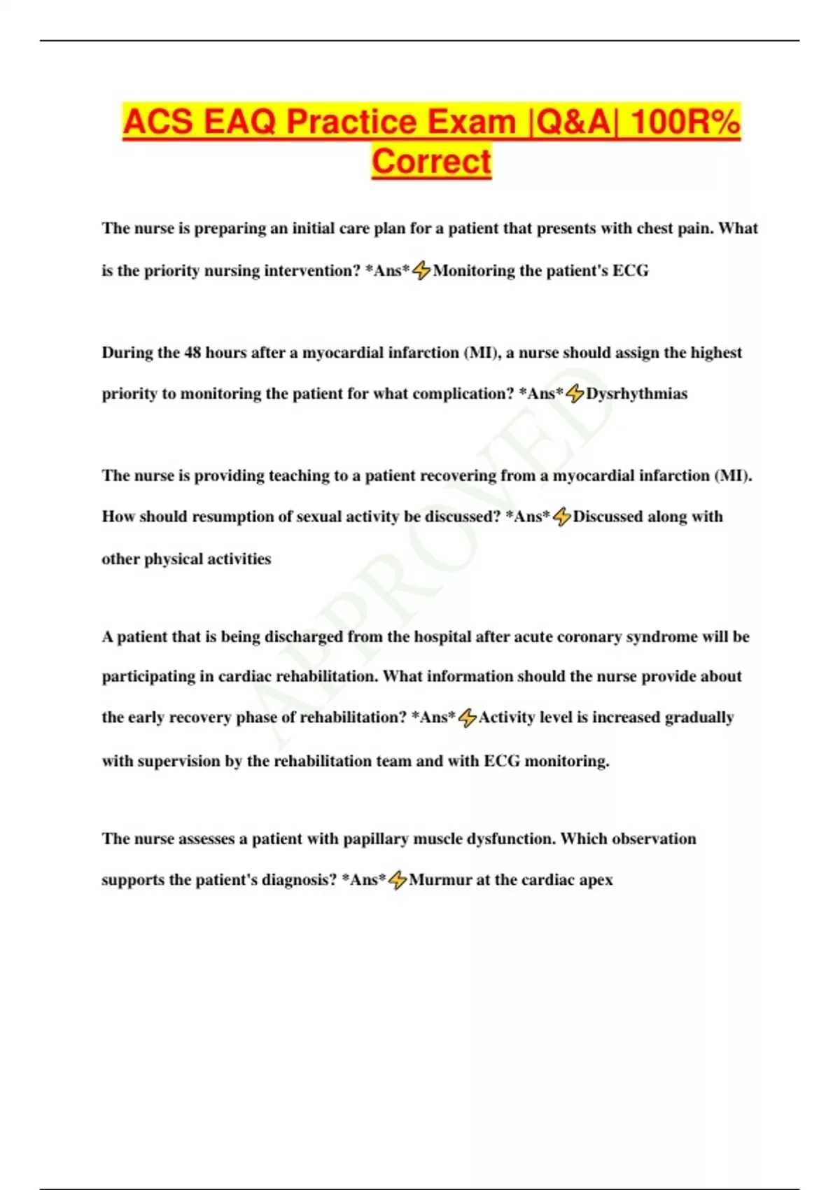 ACS EAQ Practice Exam |Q&A| 100R% Correct The nurse is preparing an initial care plan for a patient that presents with chest pain. What is the priority nursing intervention? *Ans* Monitoring the patient's ECG During the 48 hours after a myocardial infarction (MI), a nurse should assign the highest priority to monitoring the patient for what complication? *Ans* Dysrhythmias The nurse is providing teaching to a patient recovering from a myocardial infarction (MI). How should resumption of sexual activity be discussed? *Ans* Discussed along with other physical activities A patient that is being discharged from the hospital after acute coronary syndrome will be participating in cardiac rehabilitation. What information should the nurse provide about the early recovery phase of rehabilitation? *Ans* Activity level is increased gradually with supervision by the rehabilitation team and with ECG monitoring. The nurse assesses a patient with papillary muscle dysfunction. Which observation supports the patient's diagnosis? *Ans* Murmur at the cardiac apex A patient tells the nurse, "I had severe chest pain six days ago." The nurse identifies that which cardiac biomarker will be most helpful in determining whether the patient had a myocardial infarction at the time the patient experienced chest pain? *Ans* Troponin The nurse recognizes that which type of myocardial infarction (MI) may occur due to blockage of the right coronary artery? *Ans* Inferior wall MI The nurse provides information about thrombolytic therapy to a group of student nurses. Which statement made by a student nurse indicates the need for further teaching? *Ans* "Significant facial trauma within the past 3 months is a relative contraindication." The nurse assesses a patient who has been administered the tissue-type plasminogen activator alteplase for an acute myocardial infarction. Which assessment finding is the highest priority and should be reported to the primary health care provider immediately? *Ans* Hematuria The nurse recalls that which artery is most commonly used for bypass graft? *Ans* Internal mammary artery A patient experiences mild chest pain during inspiration, while coughing, and while performing daily activities. Sitting in a forward position relieves the pain. The nurse