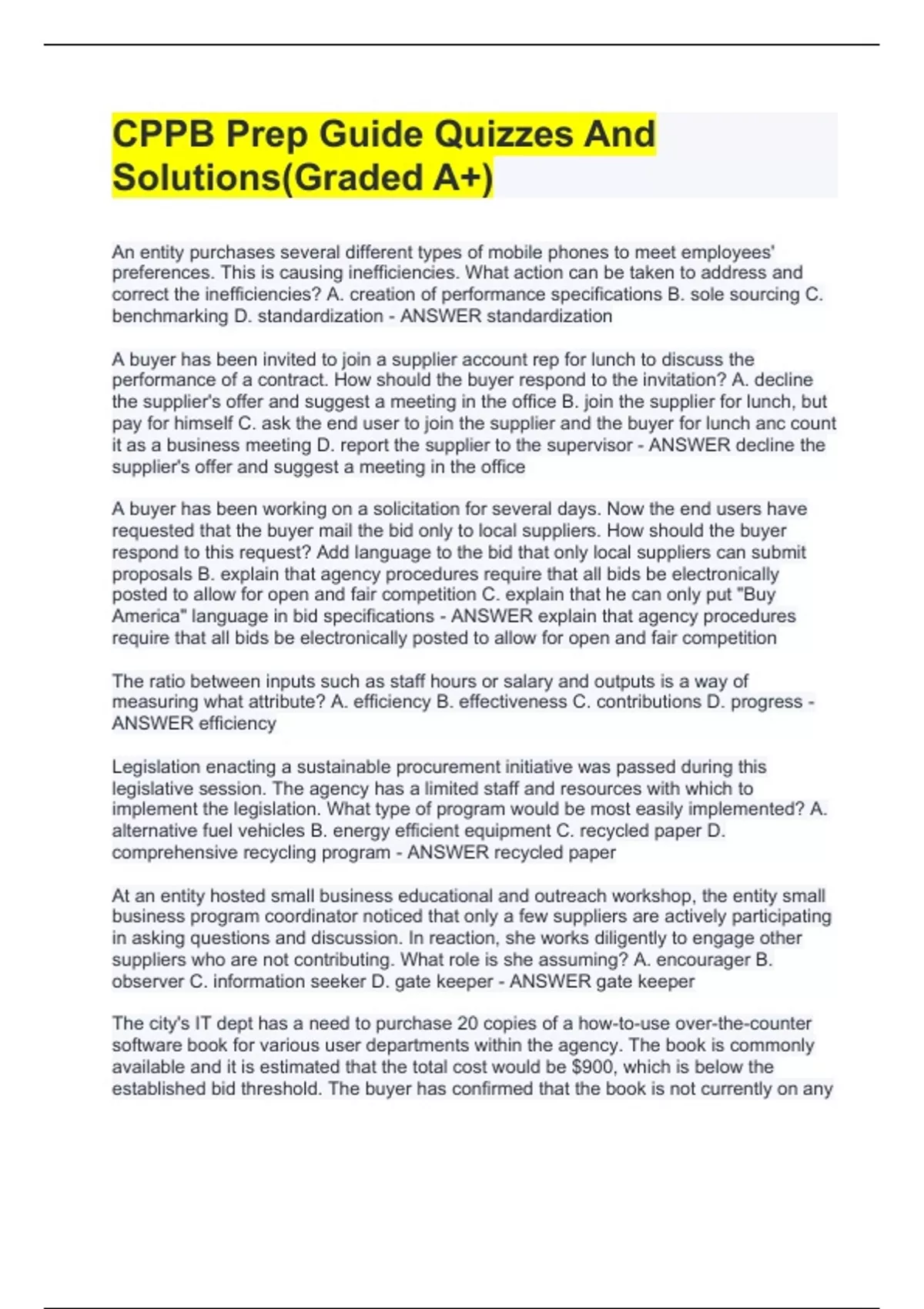An entity purchases several different types of mobile phones to meet employees' preferences. This is causing inefficiencies. What action can be taken to address and correct the inefficiencies? A. creation of performance specifications B. sole sourcing C. benchmarking D. standardization - ANSWER standardization A buyer has been invited to join a supplier account rep for lunch to discuss the performance of a contract. How should the buyer respond to the invitation? A. decline the supplier's offer and suggest a meeting in the office B. join the supplier for lunch, but pay for himself C. ask the end user to join the supplier and the buyer for lunch anc count it as a business meeting D. report the supplier to the supervisor - ANSWER decline the supplier's offer and suggest a meeting in the office A buyer has been working on a solicitation for several days. Now the end users have requested that the buyer mail the bid only to local suppliers. How should the buyer respond to this request? Add language to the bid that only local suppliers can submit proposals B. explain that agency procedures require that all bids be electronically posted to allow for open and fair competition C. explain that he can only put "Buy America" language in bid specifications - ANSWER explain that agency procedures require that all bids be electronically posted to allow for open and fair competition The ratio between inputs such as staff hours or salary and outputs is a way of measuring what attribute? A. efficiency B. effectiveness C. contributions D. progress - ANSWER efficiency Legislation enacting a sustainable procurement initiative was passed during this legislative session. The agency has a limited staff and resources with which to implement the legislation. What type of program would be most easily implemented? A. alternative fuel vehicles B. energy efficient equipment C. recycled paper D. comprehensive recycling program - ANSWER recycled paper At an entity hosted small business educational and outreach workshop, the entity small business program coordinator noticed that only a few suppliers are actively participating in asking questions and discussion. In reaction, she works diligently to engage other suppliers who are not contributing. What role is she assuming? A. encourager B. observer C. information seeker D. gate keeper - ANSWER gate keeper The city's IT dept has a need to purchase 20 copies of a how-to-use over-the-counter software book for various user departments within the agency. The book is commonly available and it is estimated that the total cost would be $900, which is below the established bid threshold. The buyer has confirmed that the book is not currently on any agen