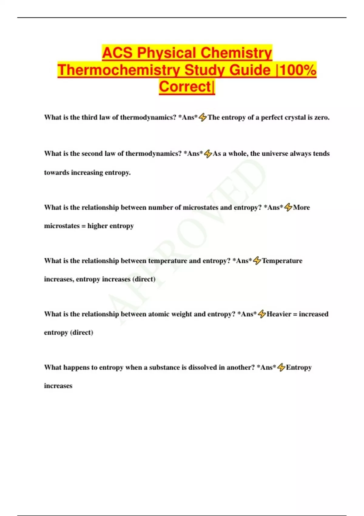 ACS Physical Chemistry Thermochemistry Study Guide |100% Correct| What is the third law of thermodynamics? *Ans* The entropy of a perfect crystal is zero. What is the second law of thermodynamics? *Ans* As a whole, the universe always tends towards increasing entropy. What is the relationship between number of microstates and entropy? *Ans* More microstates = higher entropy What is the relationship between temperature and entropy? *Ans* Temperature increases, entropy increases (direct) What is the relationship between atomic weight and entropy? *Ans* Heavier = increased entropy (direct) What happens to entropy when a substance is dissolved in another? *Ans* Entropy increases What is the relationship between moles of gas and entropy? *Ans* When moles of gas increase, entropy increases (direct) What is the relationship between free energy, enthalpy, and entropy? *Ans* deltaG(system)=deltaH(system)-TdeltaS(system) What does change in G measure? *Ans* The extent of the spontaneity of a process, and the useful energy available from it What is the relationship between work and spontaneous processes? *Ans* Spontaneous processes produce work What is the relationship between work and non-spontaneous processes? *Ans* Nonspontaneous processes require work What does -w mean? *Ans* Work is being produced - spontaneous What does a positive sign for w mean? *Ans* Work is required - non-spontaneous Can a change be spontaneous in both directions? *Ans*