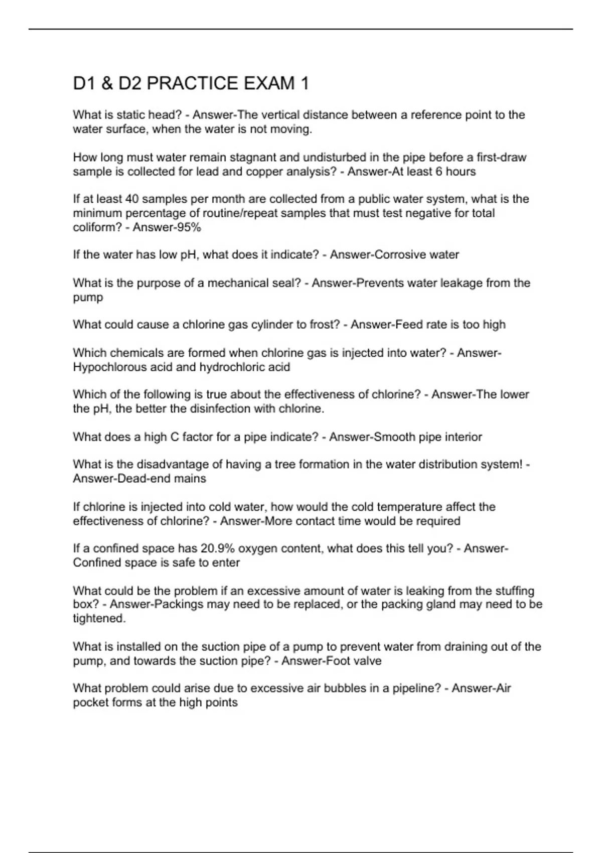 What is static head? - Answer-The vertical distance between a reference point to the water surface, when the water is not moving. How long must water remain stagnant and undisturbed in the pipe before a first-draw sample is collected for lead and copper analysis? - Answer-At least 6 hours If at least 40 samples per month are collected from a public water system, what is the minimum percentage of routine/repeat samples that must test negative for total coliform? - Answer-95% If the water has low pH, what does it indicate? - Answer-Corrosive water What is the purpose of a mechanical seal? - Answer-Prevents water leakage from the pump What could cause a chlorine gas cylinder to frost? - Answer-Feed rate is too high Which chemicals are formed when chlorine gas is injected into water? - Answer-Hypochlorous acid and hydrochloric acid Which of the following is true about the effectiveness of chlorine? - Answer-The lower the pH, the better the disinfection with chlorine. What does a high C factor for a pipe indicate? - Answer-Smooth pipe interior What is the disadvantage of having a tree formation in the water distribution system! - Answer-Dead-end mains If chlorine is injected into cold water, how would the cold temperature affect the effectiveness of chlorine? - Answer-More contact time would be required If a confined space has 20.9% oxygen content, what does this tell you? - Answer-Confined space is safe to enter What could be the problem if an excessive amount of water is leaking from the stuffing box? - Answer-Packings may need to be replaced, or the packing gland may need to be tightened. What is installed on the suction pipe of a pump to prevent water from draining out of the pump, and towards the suction pipe? - Answer-Foot valve What problem could arise due to excessive air bubbles in a pipeline? - Answer-Air pocket forms at the high points
