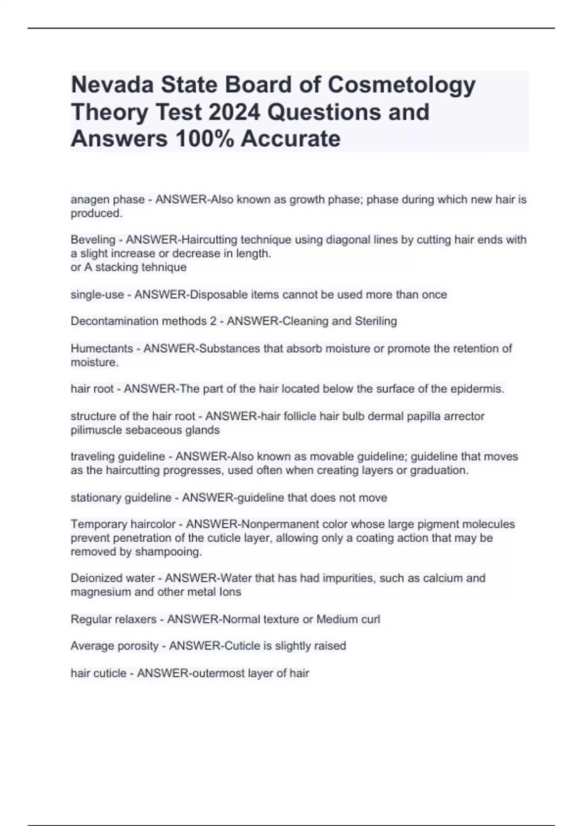 Nevada State Board of Cosmetology Theory Test 2024 Questions and Answers 100% Accurate Nevada State Board of Cosmetology Theory Test 2024 Questions and Answers 100% Accurate Nevada State Board of Cosmetology Theory Test 2024 Questions and Answers 100% Accurate Nevada State Board of Cosmetology Theory Test 2024 Questions and Answers 100% Accurate anagen phase - ANSWER-Also known as growth phase; phase during which new hair is produced. Beveling - ANSWER-Haircutting technique using diagonal lines by cutting hair ends with a slight increase or decrease in length. or A stacking tehnique single-use - ANSWER-Disposable items cannot be used more than once