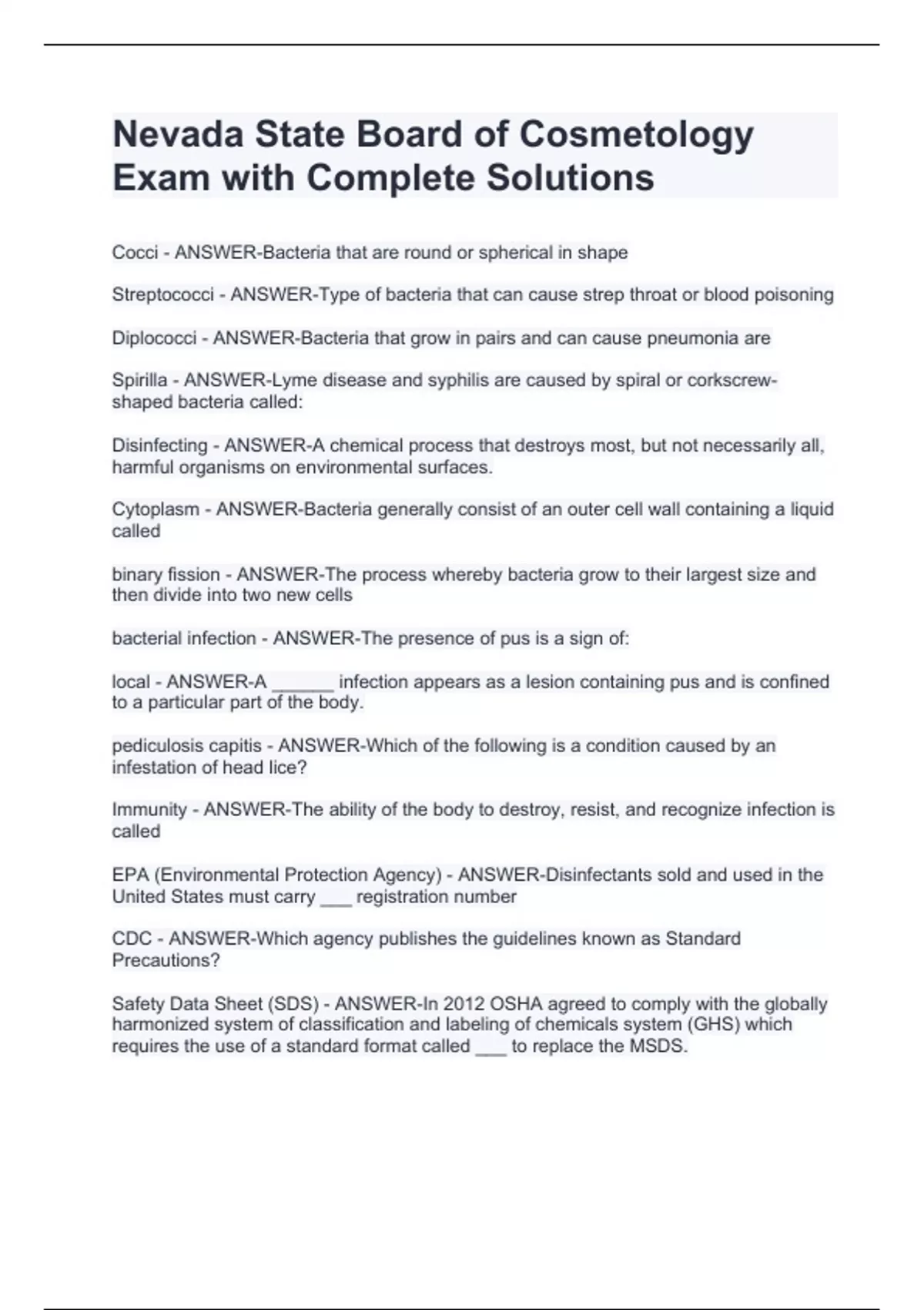 Nevada State Board of Cosmetology Exam with Complete Solutions Nevada State Board of Cosmetology Exam with Complete Solutions Nevada State Board of Cosmetology Exam with Complete Solutions Nevada State Board of Cosmetology Exam with Complete Solutions Nevada State Board of Cosmetology Exam with Complete Solutions Cocci - ANSWER-Bacteria that are round or spherical in shape Streptococci - ANSWER-Type of bacteria that can cause strep throat or blood poisoning Diplococci - ANSWER-Bacteria that grow in pairs and can cause pneumonia are Spirilla - ANSWER-Lyme disease and syphilis are caused by spiral or corkscrew-shaped bacteria called: