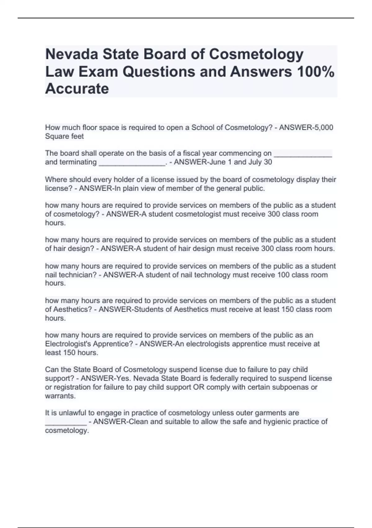 Nevada State Board of Cosmetology Law Exam Questions and Answers 100% Accurate Nevada State Board of Cosmetology Law Exam Questions and Answers 100% Accurate Nevada State Board of Cosmetology Law Exam Questions and Answers 100% Accurate Nevada State Board of Cosmetology Law Exam Questions and Answers 100% Accurate How much floor space is required to open a School of Cosmetology? - ANSWER-5,000 Square feet The board shall operate on the basis of a fiscal year commencing on ______________ and terminating ________________. - ANSWER-June 1 and July 30 Where should every holder of a license issued by the board of cosmetology display their license? - ANSWER-In plain view of member of the general public. how many hours are required to provide services on members of the public as a student of cosmetology? - ANSWER-A student cosmetologist must receive 300 class room