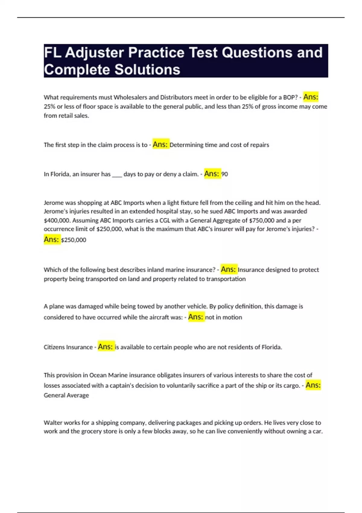 FL Adjuster Practice Test Questions and Complete Solutions.