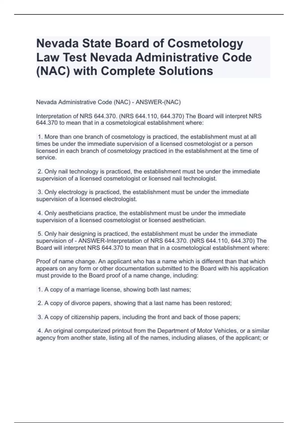Nevada State Board of Cosmetology Law Test Nevada Administrative Code (NAC) with Complete Solutions Nevada State Board of Cosmetology Law Test Nevada Administrative Code (NAC) with Complete Solutions Nevada State Board of Cosmetology Law Test Nevada Administrative Code (NAC) with Complete Solutions Nevada State Board of Cosmetology Law Test Nevada AdNevada Administrative Code (NAC) - ANSWER-(NAC) Interpretation of NRS 644.370. (NRS 644.110, 644.370) The Board will interpret NRS 644.370 to mean that in a cosmetological establishment where: 1. More than one branch of cosmetology is practiced, the establishment must at all times be under the immediate supervision of a licensed cosmetologist or a person licensed in each branch of cosmetology practiced in the establishment at the time of ministrative Code (NAC) with Complete Solutions