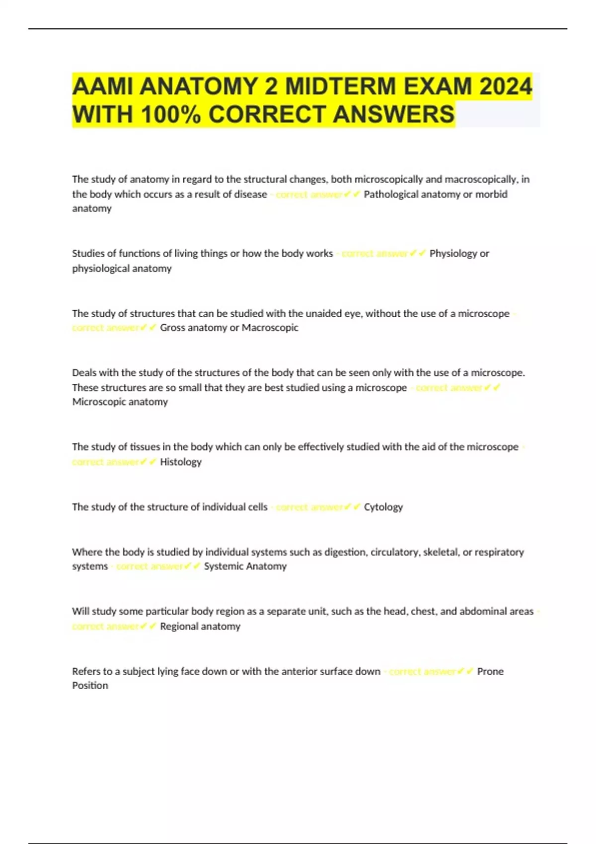 AAMI ANATOMY 2 MIDTERM EXAM 2024 WITH 100% CORRECT ANSWERS The study of anatomy in regard to the structural changes, both microscopically and macroscopically, in the body which occurs as a result of disease - correct answer Pathological anatomy or morbid anatomy Studies of functions of living things or how the body works - correct answer Physiology or physiological anatomy The study of structures that can be studied with the unaided eye, without the use of a microscope - correct answer Gross anatomy or Macroscopic Deals with the study of the structures of the body that can be seen only with the use of a microscope. These structures are so small that they are best studied using a microscope - correct answer Microscopic anatomy The study of tissues in the body which can only be effectively studied with the aid of the microscope - correct answer Histology The study of the structure of individual cells - correct answer Cytology Where the body is studied by individual systems such as digestion, circulatory, skeletal, or respiratory systems - correct answer Systemic Anatomy Will study some particular body region as a separate unit, such as the head, chest, and abdominal areas - correct answer Regional anatomy Refers to a subject lying face down or with the anterior surface down - correct answer Prone Position