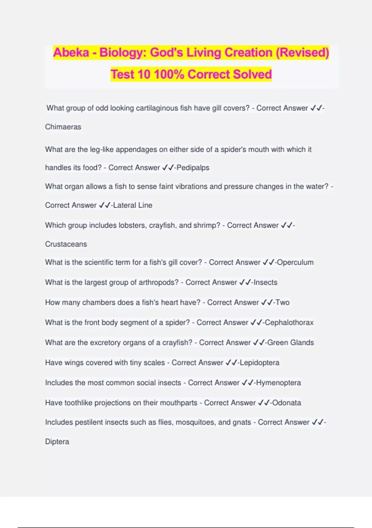 Abeka - Biology: God's Living Creation (Revised) Test 10 100% Correct Solved What group of odd looking cartilaginous fish have gill covers? - Correct Answer ️️ - Chimaeras What are the leg-like appendages on either side of a spider's mouth with which it handles its food? - Correct Answer ️️ -Pedipalps What organ allows a fish to sense faint vibrations and pressure changes in the water? - Correct Answer ️️ -Lateral Line Which group includes lobsters, crayfish, and shrimp? - Correct Answer ️️ - Crustaceans What is the scientific term for a fish's gill cover? - Correct Answer ️️ -Operculum What is the largest group of arthropods? - Correct Answer ️️ -Insects How many chambers does a fish's heart have? - Correct Answer ️️ -Two What is the front body segment of a spider? - Correct Answer ️️ -Cephalothorax What are the excretory organs of a crayfish? - Correct Answer ️️ -Green Glands Have wings covered with tiny scales - Correct Answer ️️ -Lepidoptera Includes the most common social insects - Correct Answer ️️ -Hymenoptera Have toothlike projections on their mouthparts - Correct Answer ️️ -Odonata Includes pestilent insects such as flies, mosquitoes, and gnats - Correct Answer ️️ - Diptera Have hard, shell-like forewings - Correct Answer ️️ -Coleoptera A median fin on the top of a fish's body is a _______ fin - Correct Answer ️️ -Dorsal The large fin at the rear of a fish that serves as the fish's propeller and rudder is the _________ fin - Correct Answer ️️ -Caudal In scientific usage, any insect with piercing-sucking mouthparts and a half-wing design is a __________ - Correct Answer ️️ -Bug The exoskeleton of an arthropod is composed of __________ - Correct Answer ️️ - Chitin Spiders, ticks scorpions, and daddy longlegs are classified as ___________ - Correct Answer ️️ -Arachnids A faceted eye composed of many independent lenses and "retinas" is a ________ eye - Correct Answer ️️ -Compound The largest known fish is the ______________ - Correct Answer ️️ -Whale Shark The unusual cartilaginous fish that lack jaws are the lamprey and __________ - Correct Answer ️️ -Hagfish The wings of an insect are attached to the __________ - Correct Answer ️️ -Thorax The portion of an insect's body that contains the heart and much of the digestive, respiratory, and excretory systems is the _______ - Correct Answer ️️ -Abdomen The vane-like projections from the front of a fish's gill arches that protect the gills by straining debris from the water are the _______. - Correct Answer ️️ -Gill Rakers The small, bony plates embedded in a fish's skin that act as a protect